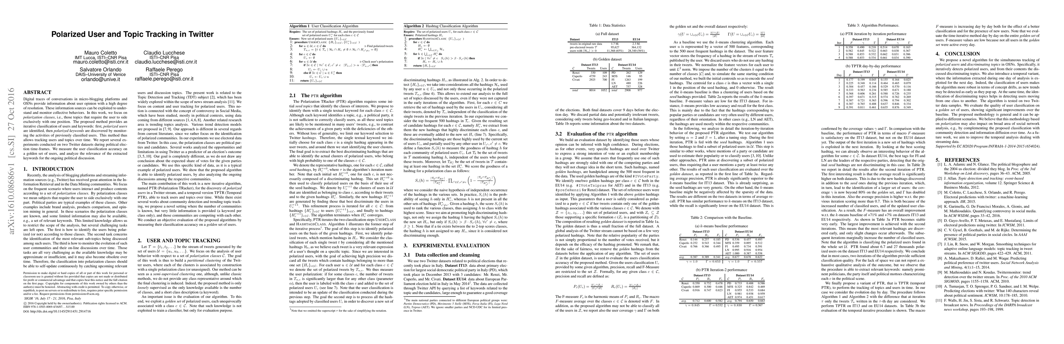 Digital traces of conversations in micro-blogging platforms and OSNs provide information about user opinion with a high degree of resolution. These information sources can be exploited to under- stand and monitor collective behaviors. In this work, we focus on polarization classes, i.e., those topics that require the user to side exclusively with one position. The proposed method provides an iterative classification of users and keywords: first, polarized users are identified, then polarized keywords are discovered by monitoring the activities of previously classified users. This method thus allows tracking users and topics over time. We report several experiments conducted on two Twitter datasets during political election time-frames. We measure the user classification accuracy on a golden set of users, and analyze the relevance of the extracted keywords for the ongoing political discussion.