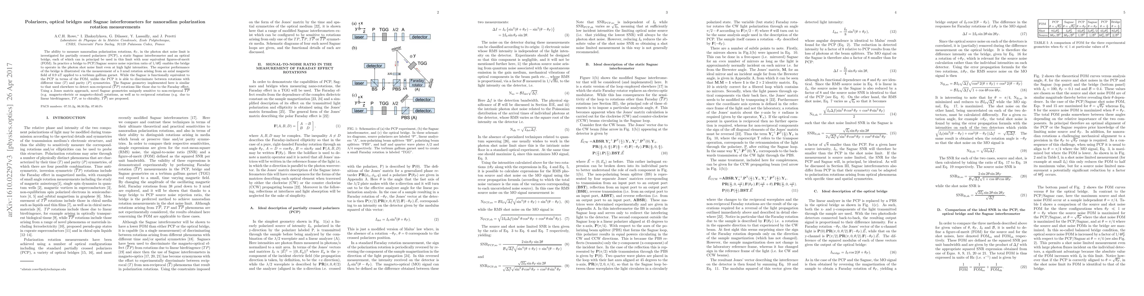 The ability to measure nanoradian polarization rotations, $\theta_F$, in the photon shot noise limit is investigated for partially crossed polarizers (PCP), a static Sagnac interferometer and an optical bridge, each of which can in principal be used in this limit with near equivalent figures-of-merit (FOM). In practice a bridge to PCP/Sagnac source noise rejection ratio of $1/4\theta_F^2$ enables the bridge to operate in the photon shot noise limit even at high light intensities. The superior performance of the bridge is illustrated via the measurement of a 3 nrad rotation arising from an axial magnetic field of 0.9 nT applied to a terbium gallium garnet. While the Sagnac is functionally equivalent to the PCP in terms of the FOM, unlike the PCP it is able to discriminate between rotations with different time ($T$) and parity ($P$) symmetries. The Sagnac geometry implemented here is similar to that used elsewhere to detect non-reciprocal ($\overline{T}P$) rotations like those due to the Faraday effect. Using a Jones matrix approach, novel Sagnac geometries uniquely sensitive to non-reciprocal $\overline{TP}$ (e.g. magneto-electric or magneto-chiral) rotations, as well as to reciprocal rotations (e.g. due to linear birefringence, $TP$, or to chirality, $T\overline{P}$) are proposed.