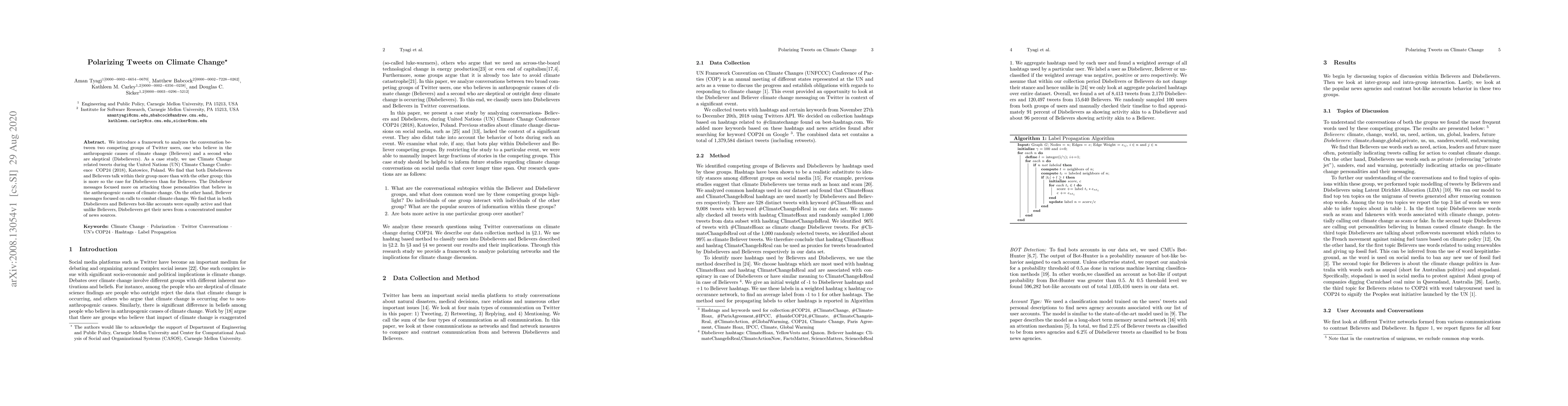 We introduce a framework to analyze the conversation between two competing groups of Twitter users, one who believe in the anthropogenic causes of climate change (Believers) and a second who are skeptical (Disbelievers). As a case study, we use Climate Change related tweets during the United Nation's (UN) Climate Change Conference - COP24 (2018), Katowice, Poland. We find that both Disbelievers and Believers talk within their group more than with the other group; this is more so the case for Disbelievers than for Believers. The Disbeliever messages focused more on attacking those personalities that believe in the anthropogenic causes of climate change. On the other hand, Believer messages focused on calls to combat climate change. We find that in both Disbelievers and Believers bot-like accounts were equally active and that unlike Believers, Disbelievers get their news from a concentrated number of news sources.