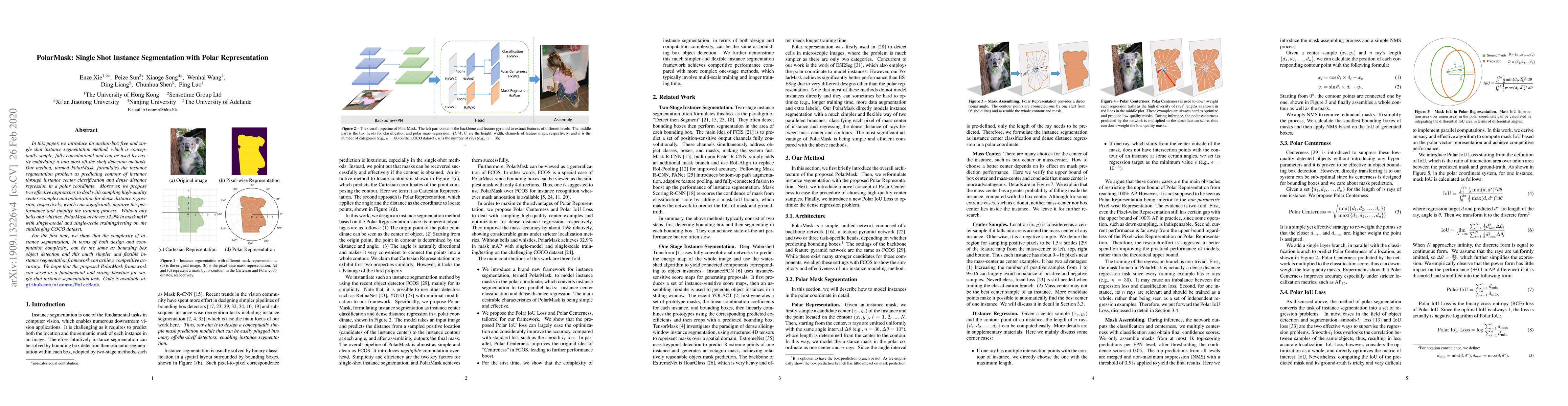 PolarMask presents an anchor-box free, single-shot instance segmentation method using polar representation, achieving competitive accuracy on the COCO dataset. It simplifies the training process and can be easily integrated into existing detection frameworks.