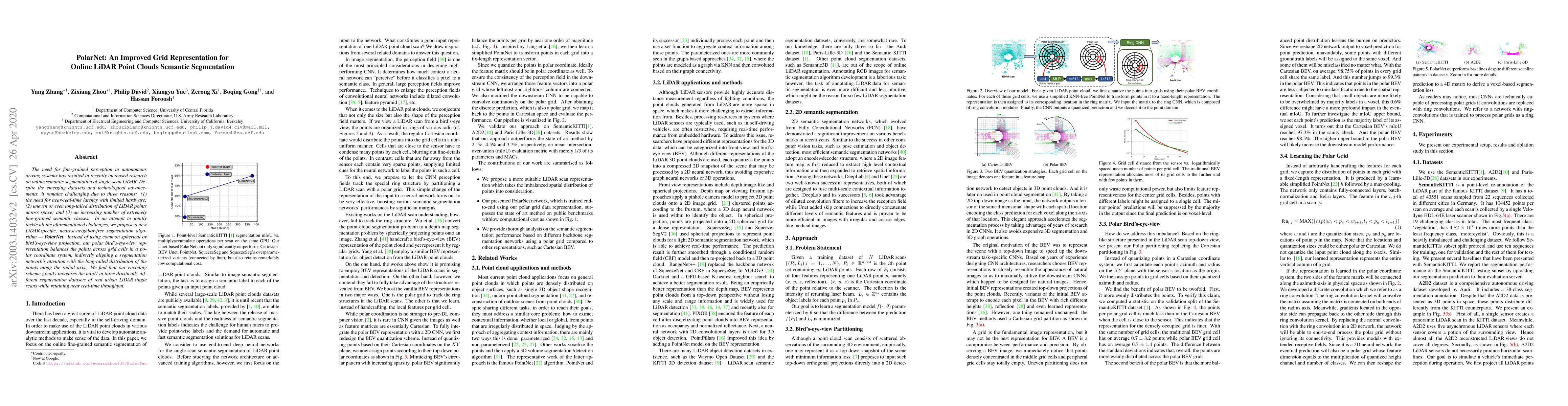 PolarNet proposes a novel polar bird's-eye-view representation for online LiDAR point clouds to improve semantic segmentation in autonomous driving. This method balances LiDAR points across grid cells, enhancing segmentation accuracy and maintaining near-real-time performance.