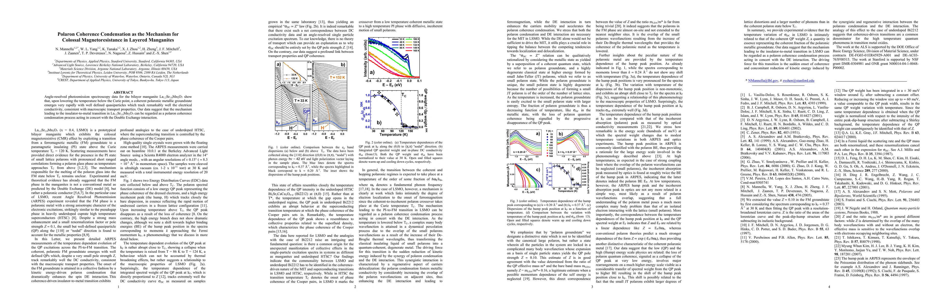 Angle-resolved photoemission spectroscopy data for the bilayer manganite La1.2Sr1.8Mn2O7 show that, upon lowering the temperature below the Curie point, a coherent polaronic metallic groundstate emerges very rapidly with well defined quasiparticles which track remarkably well the electrical conductivity, consistent with macroscopic transport properties. Our data suggest that the mechanism leading to the insulator-to-metal transition in La1.2Sr1.8Mn2O7 can be regarded as a polaron coherence condensation process acting in concert with the Double Exchange interaction.