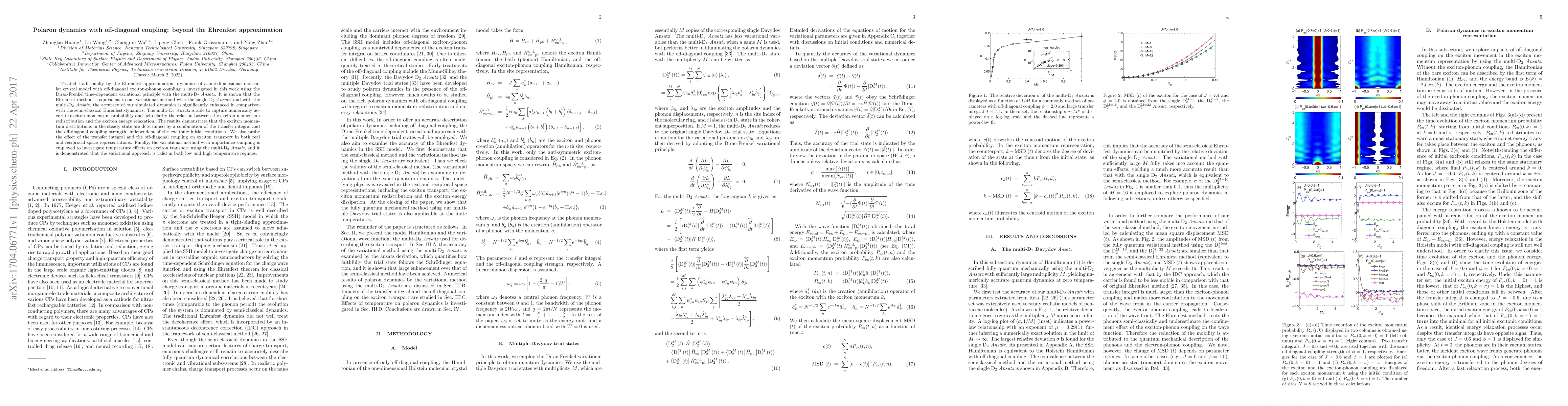 This research paper investigates the dynamics of a one-dimensional molecular crystal model using a variational method beyond the Ehrenfest approximation, showing enhanced accuracy over traditional methods. The study reveals that exciton momentum distributions in steady states are determined by a combination of transfer integrals and off-diagonal coupling, and examines temperature effects on exciton transport.