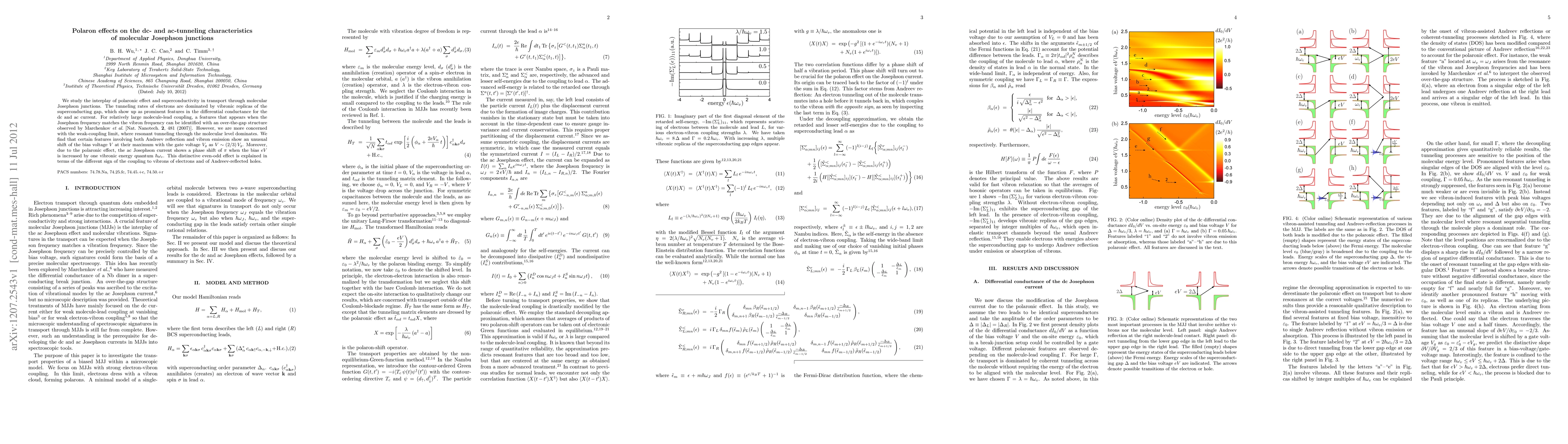 This research investigates how polaronic effects influence electron tunneling and superconducting properties in molecular Josephson junctions, revealing unique features in dc and ac current conductance and an unusual bias voltage shift due to polaronic interactions. The study also notes a phase shift in ac Josephson current related to the vibronic energy quantum.