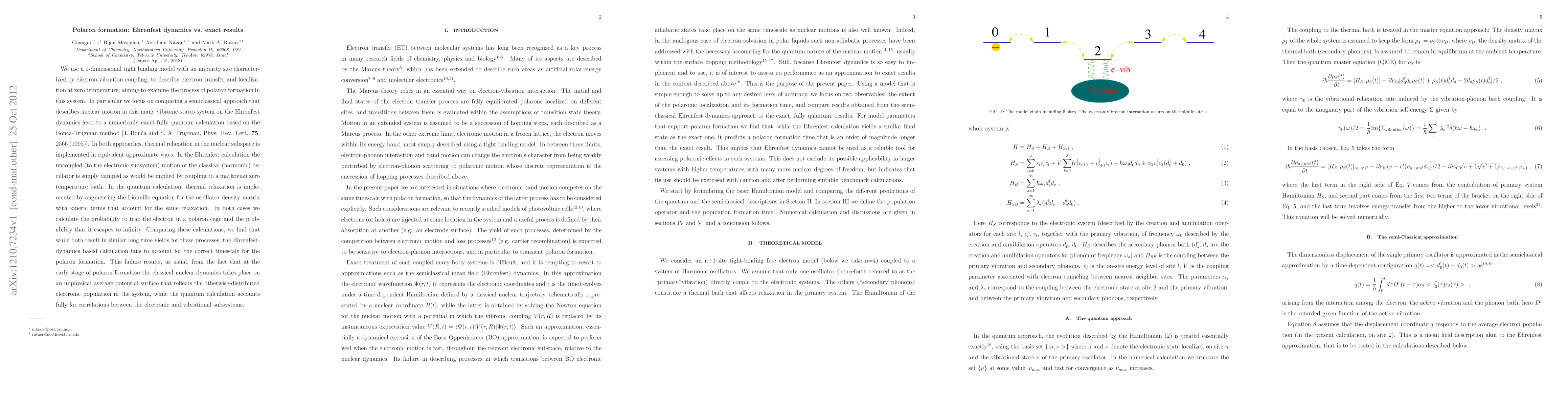 This paper compares the dynamics of polaron formation in a 1D tight-binding model using Ehrenfest dynamics and exact quantum calculations, finding that while both methods yield similar long-term outcomes, the Ehrenfest approach fails to capture the correct timescale due to its reliance on an unphysical average potential surface during early polaron formation stages.