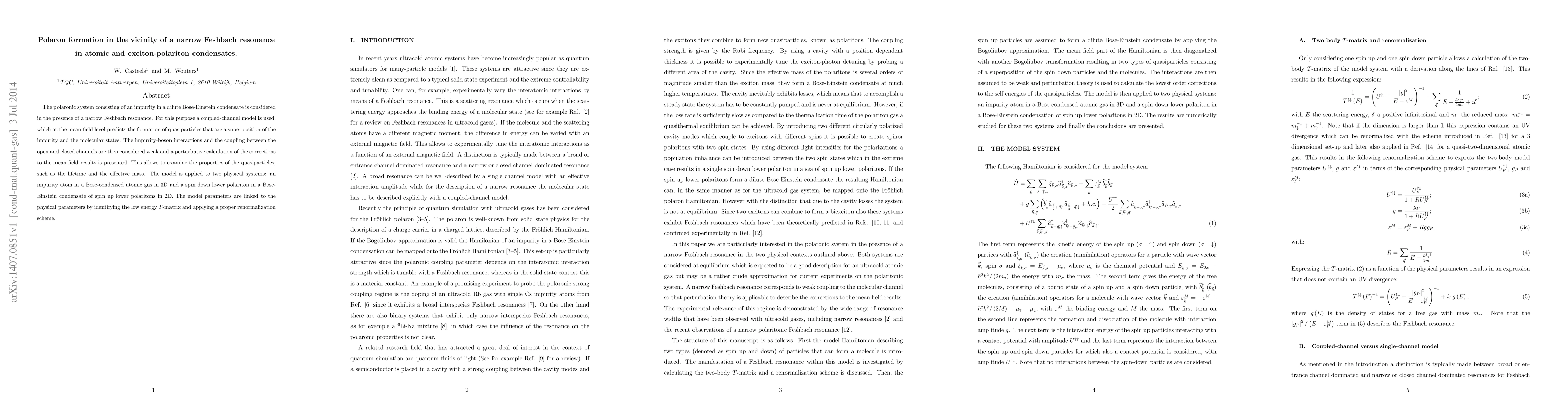 Researchers studied polaron formation in atomic and exciton-polariton condensates near a narrow Feshbach resonance using a coupled-channel model, revealing quasiparticles with lifetime and effective mass properties.