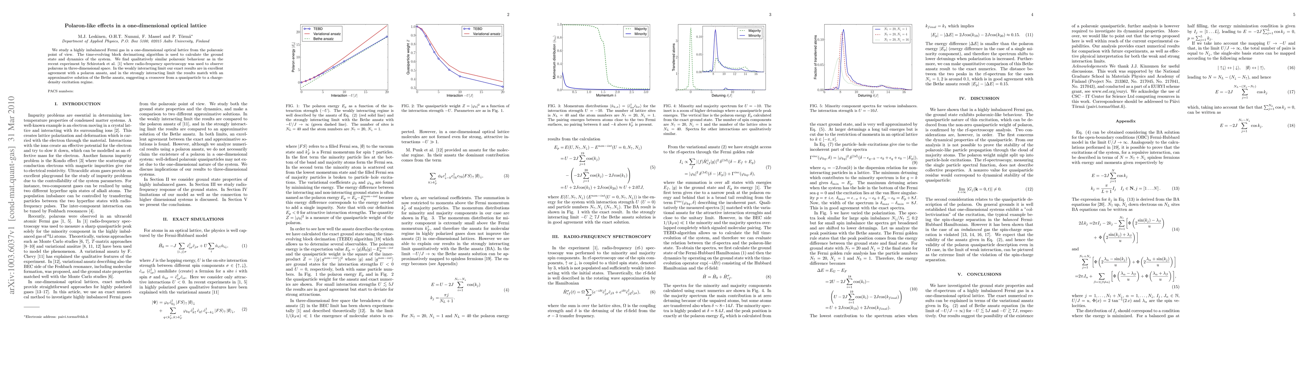 We study a highly imbalanced Fermi gas in a one-dimensional optical lattice from the polaronic point of view. The time-evolving block decimationg algorithm is used to calculate the ground state and dynamics of the system. We find qualitatively similar polaronic behaviour as in the recent experiment by Schirotzek et al. \cite{Schirotzek2009a} where radio-frequency spectroscopy was used to observe polarons in three-dimensional space. In the weakly interacting limit our exact results are in excellent agreement with a polaron ansatz, and in the strongly interacting limit the results match with an approximative solution of the Bethe ansatz, suggesting a crossover from a quasiparticle to a charge-density excitation regime.