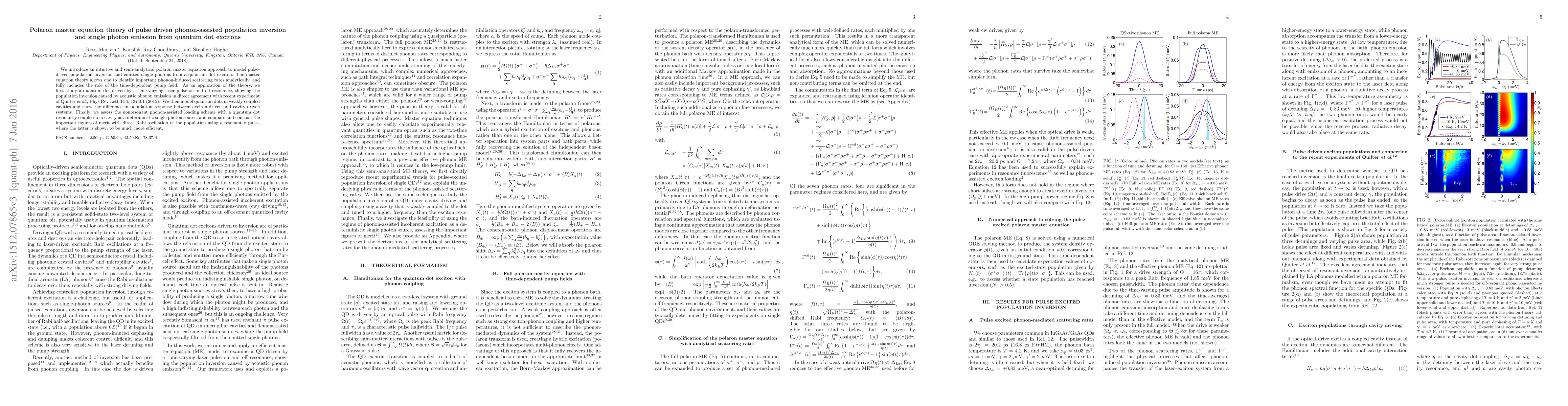 This research introduces a polaron master equation theory to model pulse-driven population inversion and single photon emission in quantum dot excitons, identifying phonon-induced scattering rates and analyzing the effects of a time-varying pump field. The theory demonstrates agreement with experimental results and evaluates the efficiency of phonon-assisted single photon emission compared to resonant Rabi oscillation.
