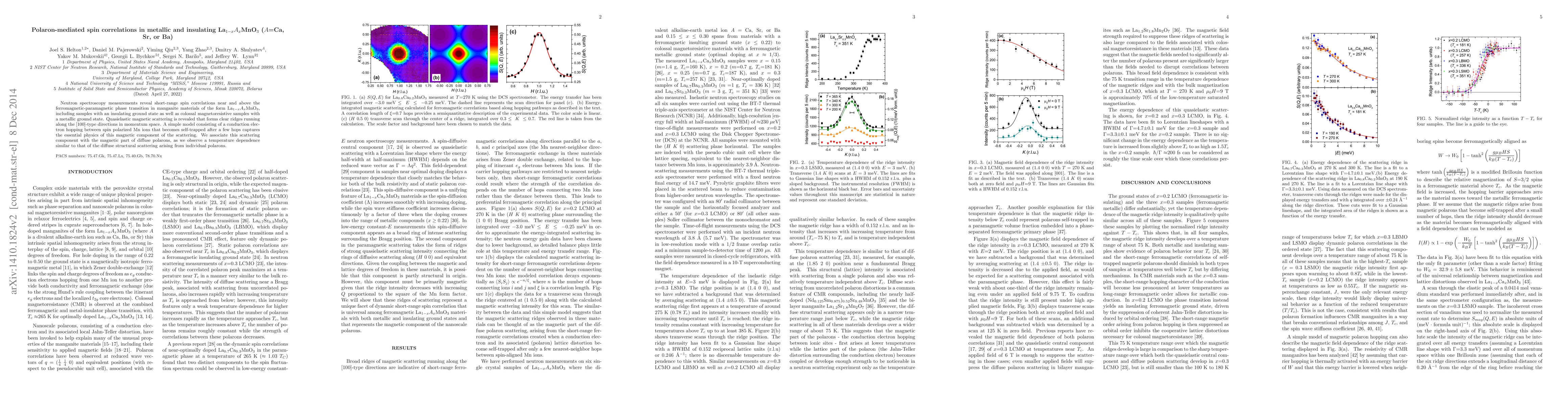 Neutron spectroscopy identifies quasielastic magnetic scattering in La$_{1-x}A_{x}$MnO$_{3}$ manganites, showing short-range spin correlations near the ferromagnetic-paramagnetic transition. The scattering is attributed to polaron-mediated spin correlations, with ridges along [100]-type directions, indicative of self-trapped conduction electrons hopping between polarized Mn ions.