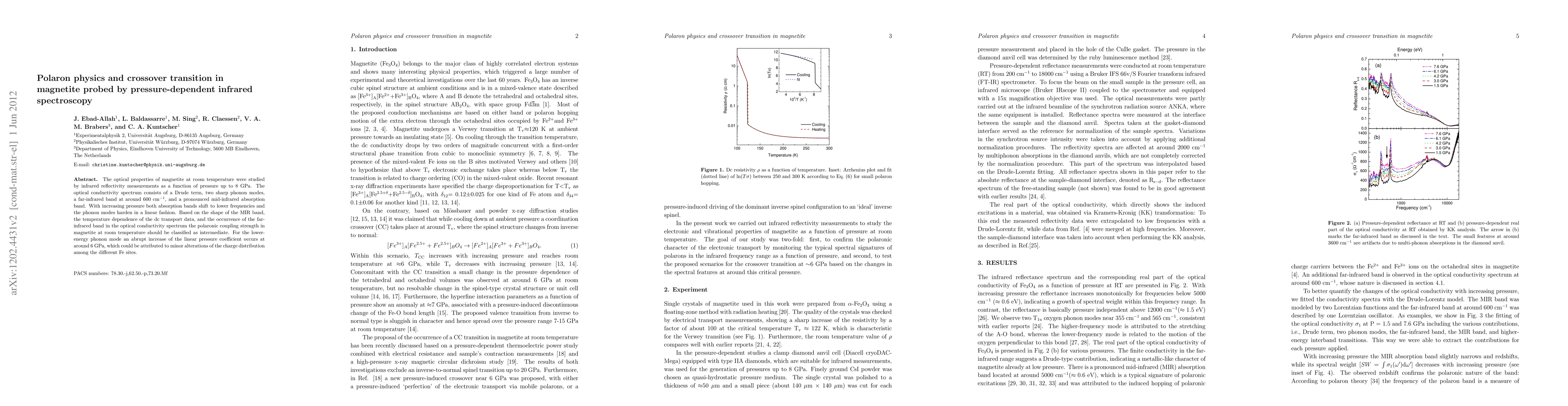 The optical properties of magnetite at room temperature were studied by infrared reflectivity measurements as a function of pressure up to 8 GPa. The optical conductivity spectrum consists of a Drude term, two sharp phonon modes, a far-infrared band at around 600 cm$^{-1}$, and a pronounced mid-infrared absorption band. With increasing pressure both absorption bands shift to lower frequencies and the phonon modes harden in a linear fashion. Based on the shape of the MIR band, the temperature dependence of the dc transport data, and the occurrence of the far-infrared band in the optical conductivity spectrum the polaronic coupling strength in magnetite at room temperature should be classified as intermediate. For the lower-energy phonon mode an abrupt increase of the linear pressure coefficient occurs at around 6 GPa, which could be attributed to minor alterations of the charge distribution among the different Fe sites.
