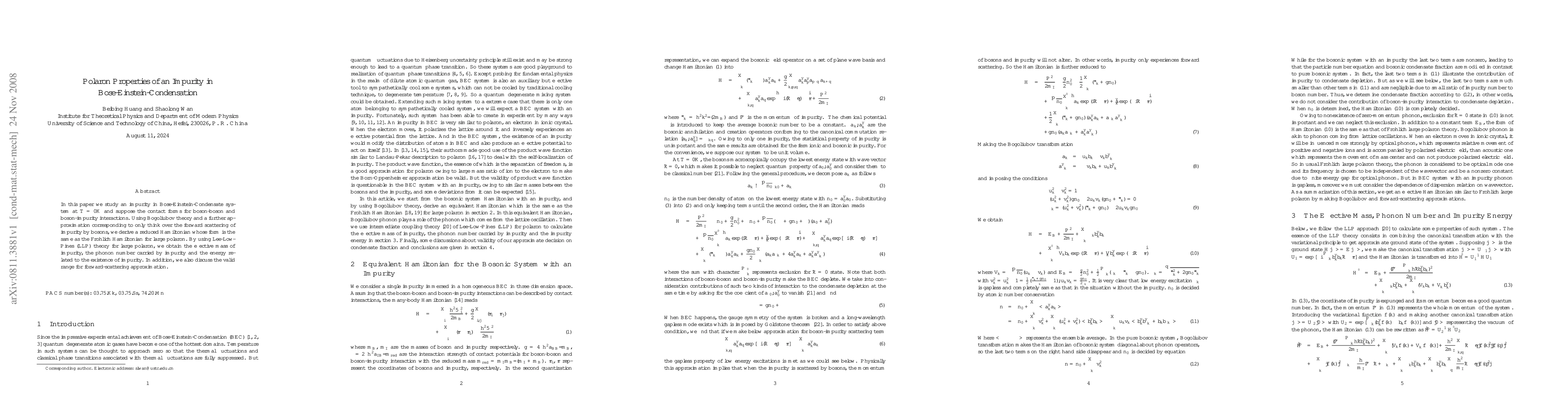 This paper investigates the polaron properties of an impurity in a Bose-Einstein condensate at absolute zero, deriving a reduced Hamiltonian similar to the Fröhlich Hamiltonian for large polarons. Using Lee-Low-Pines theory, it determines the effective mass, phonon number, and energy associated with the impurity, while also discussing the validity of the forward-scattering approximation.