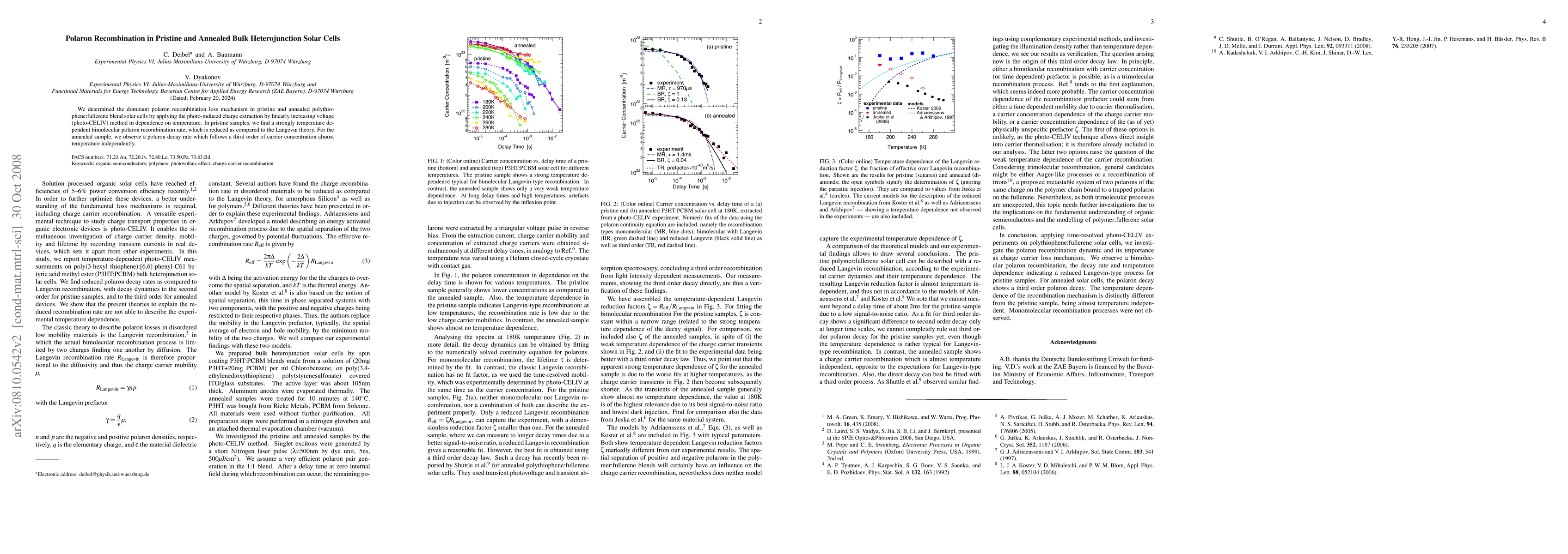This study investigates polaron recombination in polythiophene:fullerene solar cells using photo-CELIV, revealing a temperature-dependent bimolecular recombination in pristine samples and a third-order carrier concentration-dependent recombination in annealed samples, indicating improved recombination efficiency post-annealing.