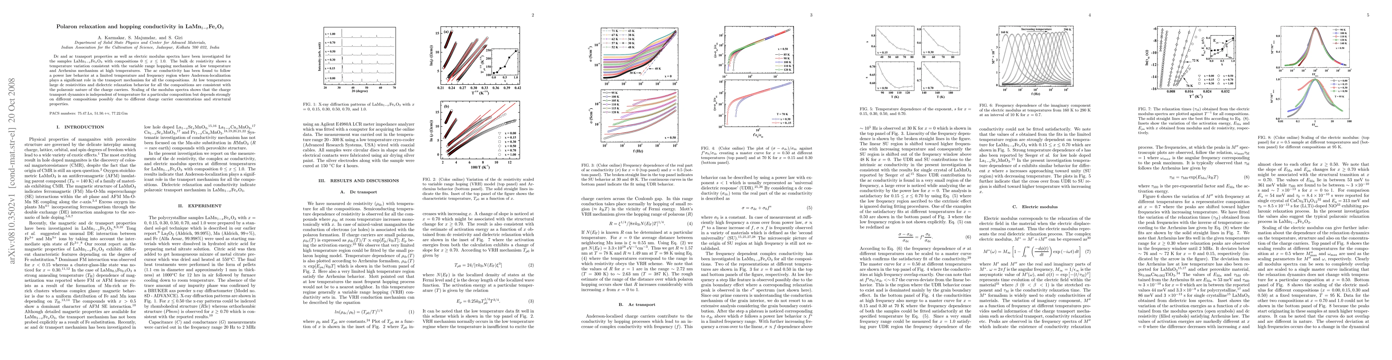 Dc and ac transport properties as well as electric modulus spectra have been investigated for the samples LaMn$_{1-x}$Fe$_{x}$O$_3$ with compositions 0 $\leq x \leq$ 1.0. The bulk dc resistivity shows a temperature variation consistent with the variable range hopping mechanism at low temperature and Arrhenius mechanism at high temperatures. The ac conductivity has been found to follow a power law behavior at a limited temperature and frequency region where Anderson-localization plays a significant role in the transport mechanism for all the compositions. At low temperatures large dc resistivities and dielectric relaxation behavior for all the compositions are consistent with the polaronic nature of the charge carriers. Scaling of the modulus spectra shows that the charge transport dynamics is independent of temperature for a particular composition but depends strongly on different compositions possibly due to different charge carrier concentrations and structural properties.