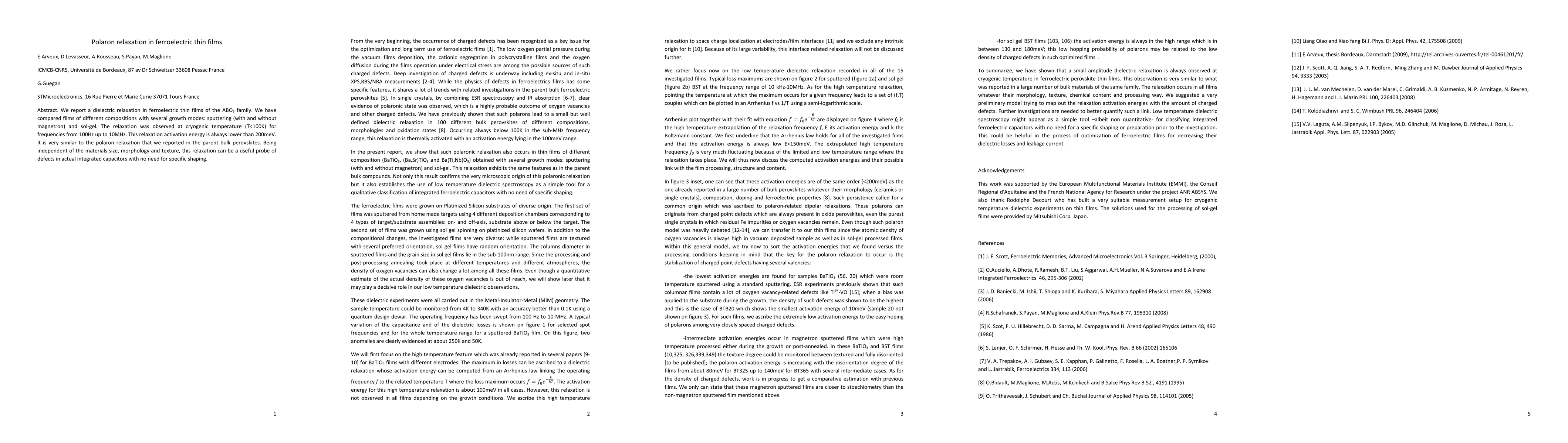 This study investigates dielectric relaxation in ferroelectric thin films of the ABO3 family, revealing a polaron relaxation phenomenon at cryogenic temperatures. The relaxation is consistent across different growth methods and is a valuable probe for identifying defects in integrated capacitors.
