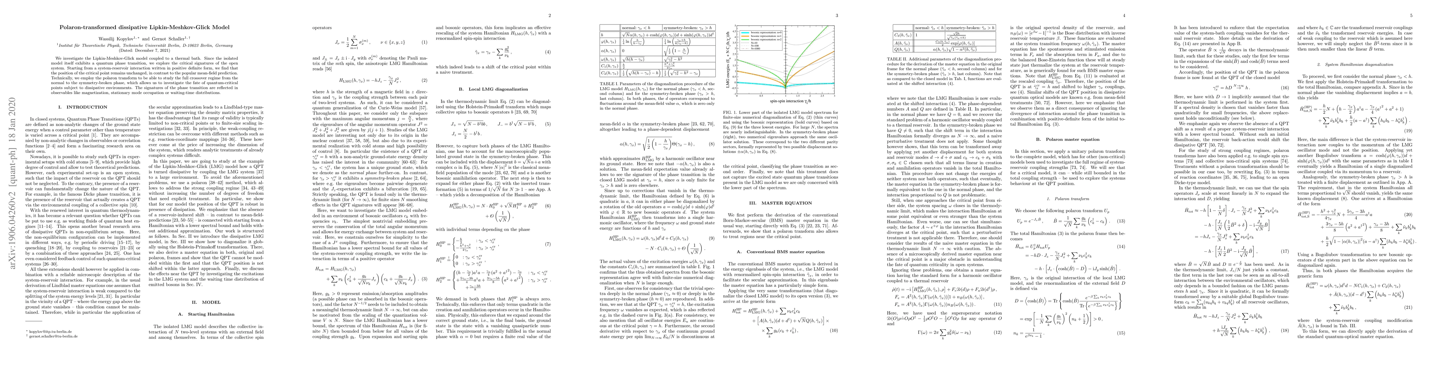 We investigate the Lipkin-Meshkov-Glick model coupled to a thermal bath. Since the isolated model itself exhibits a quantum phase transition, we explore the critical signatures of the open system. Starting from a system-reservoir interaction written in positive definite form, we find that the position of the critical point remains unchanged, in contrast to the popular mean-field prediction. Technically, we employ the polaron transform to be able to study the full crossover regime from the normal to the symmetry-broken phase, which allows us to investigate the fate of quantum-critical points subject to dissipative environments. The signatures of the phase transition are reflected in observables like stationary mode occupation or waiting-time distributions.