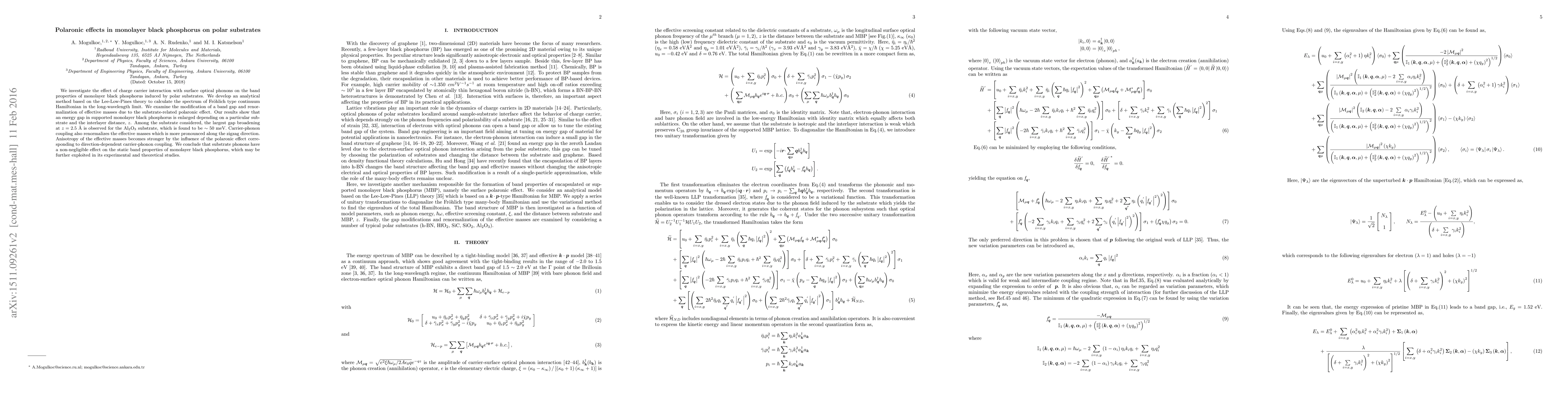 This paper explores how charge carriers in monolayer black phosphorus interact with surface optical phonons on polar substrates, leading to polaronic effects that modify the material's band structure. The study reveals that substrate-induced polaronic effects significantly broaden the energy gap and renormalize effective masses, with the largest effect observed for Al₂O₃ substrates at a specific interlayer distance.