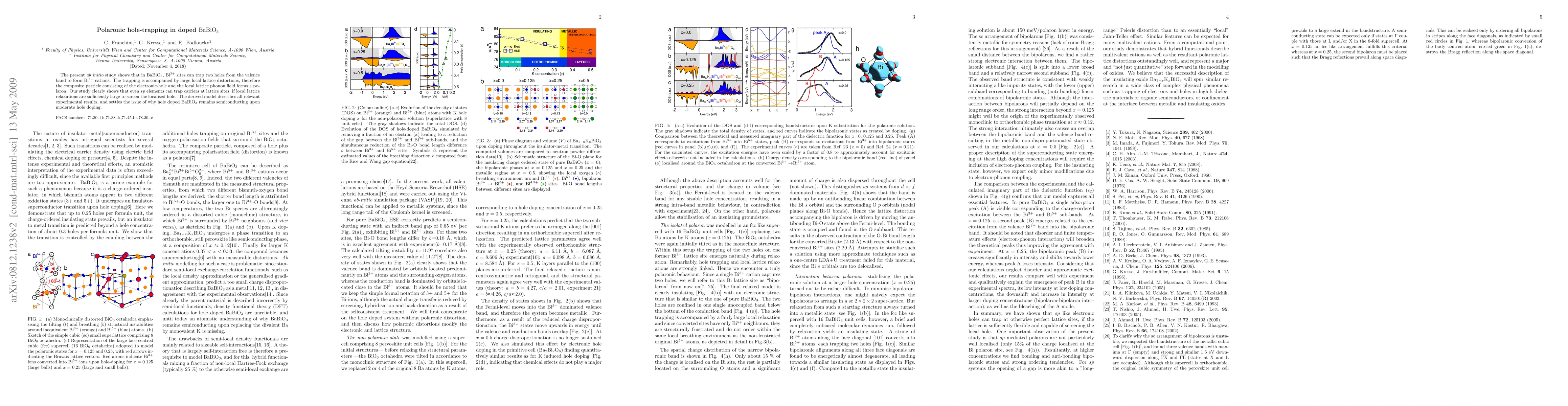 The present {\em ab initio} study shows that in BaBiO$_3$, Bi$^{3+}$ sites can trap two holes from the valence band to form Bi$^{5+}$ cations. The trapping is accompanied by large local lattice distortions, therefore the composite particle consisting of the electronic-hole and the local lattice phonon field forms a polaron. Our study clearly shows that even $sp$ elements can trap carriers at lattice sites, if local lattice relaxations are sufficiently large to screen the localised hole. The derived model describes all relevant experimental results, and settles the issue of why hole doped BaBiO$_3$ remains semiconducting upon moderate hole doping.