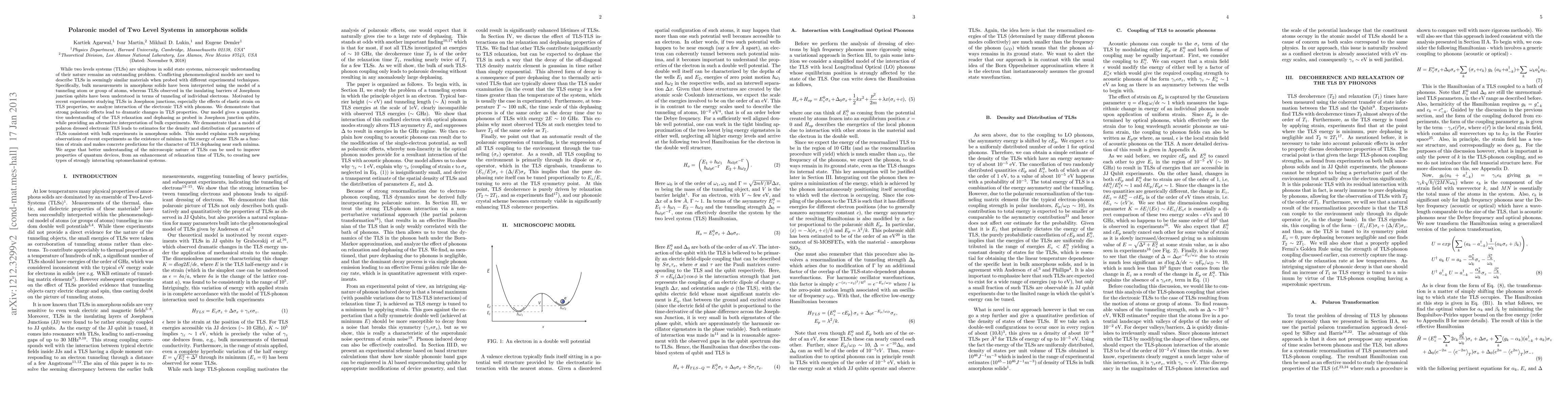 This paper proposes a polaronic model to explain Two Level Systems (TLSs) in amorphous solids, showing that strong polaronic effects significantly alter TLS properties. The model provides a quantitative understanding of TLS relaxation and dephasing in Josephson junction qubits and offers an alternative interpretation for bulk experiments, explaining the existence of minima in the energy of some TLSs under strain and predicting TLS dephasing behavior.