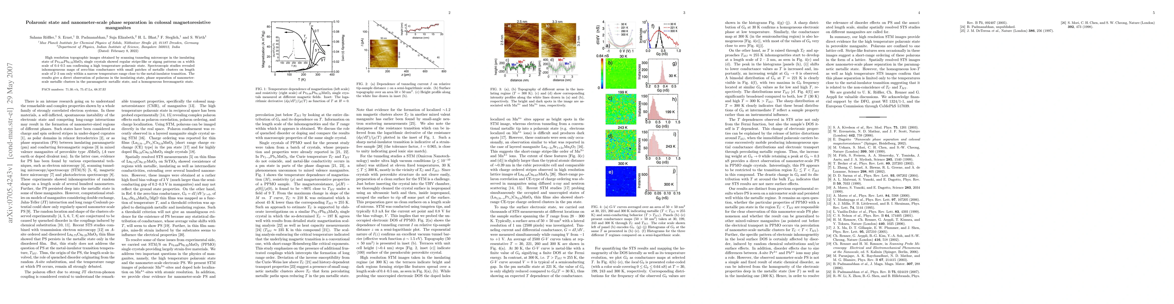 This paper reports high-resolution observations of polaronic states and nanometer-scale phase separation in colossal magnetoresistive manganites using scanning tunneling microscopy. The study confirms the existence of polarons in the insulating state and reveals metallic clusters in the paramagnetic metallic state near the metal-insulator transition.