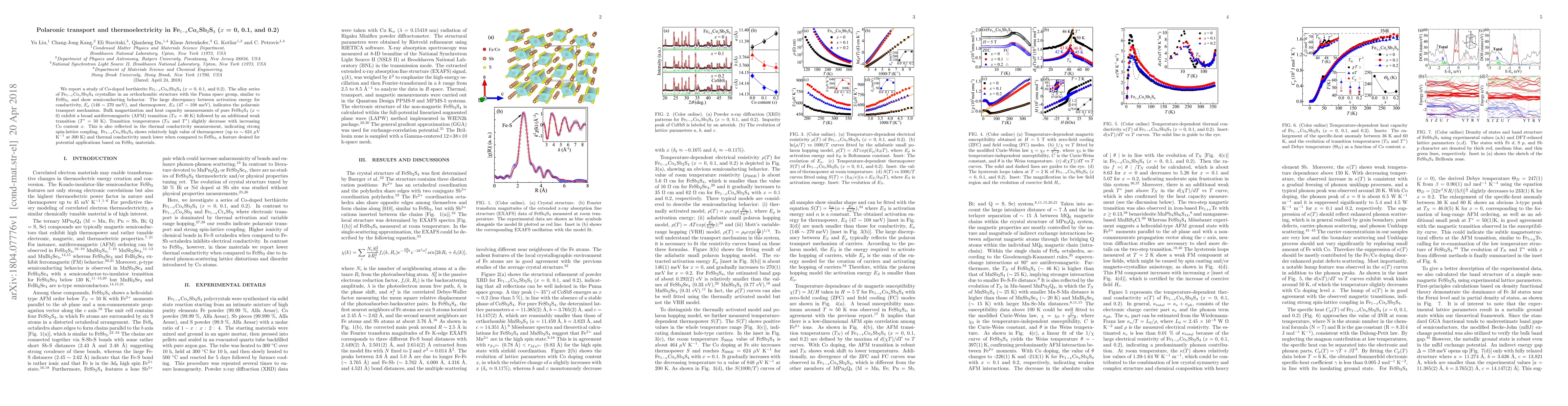 The study investigates Co-doped Fe$_{1-x}$Co$_x$Sb$_2$S$_4$ ($x$ = 0, 0.1, and 0.2) showing semiconducting behavior and polaronic transport due to the large difference between activation energies for conductivity and thermopower. The materials exhibit high thermopower and low thermal conductivity, desirable for thermoelectric applications.