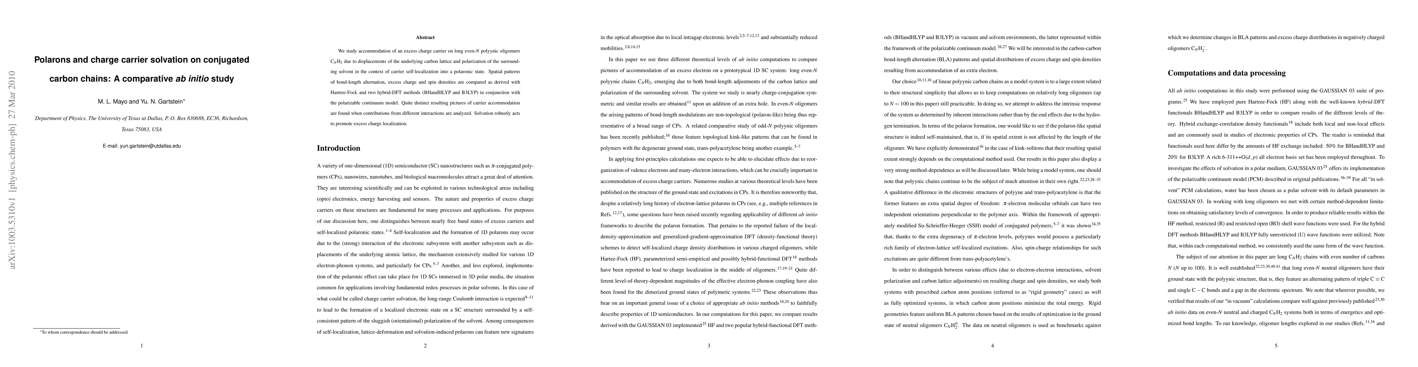 We study accommodation of an excess charge carrier on long even-N polyynic oligomers C_{N}H_{2} due to displacements of the underlying carbon lattice and polarization of the surrounding solvent in the context of carrier self-localization into a polaronic state. Spatial patterns of bond-length alternation, excess charge and spin densities are compared as derived with Hartree-Fock and two hybrid-DFT methods (BHandHLYP and B3LYP) in conjunction with the polarizable continuum model. Quite distinct resulting pictures of carrier accommodation are found when contributions from different interactions are analyzed. Solvation robustly acts to promote excess charge localization.