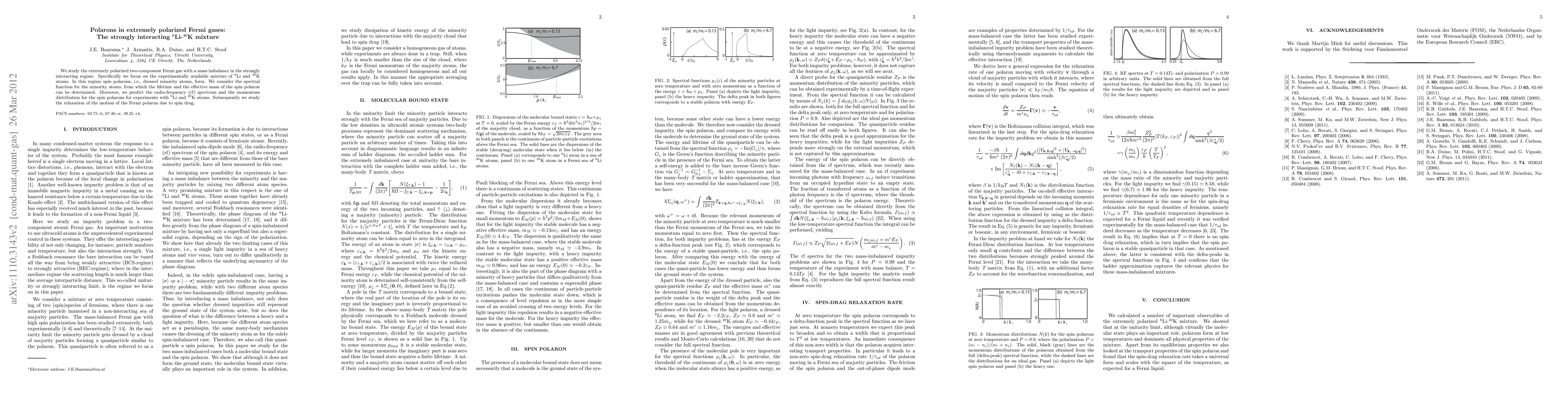 We study the extremely polarized two-component Fermi gas with a mass imbalance in the strongly interacting regime. Specifically we focus on the experimentally available mixture of ${}^6$Li and ${}^{40}$K atoms. In this regime spin polarons, i.e., dressed minority atoms, form. We consider the spectral function for the minority atoms, from which the lifetime and the effective mass of the spin polaron can be determined. Moreover, we predict the radio-frequency (RF) spectrum and the momentum distribution for the spin polarons for experiments with ${}^6$Li and ${}^{40}$K atoms. Subsequently we study the relaxation of the motion of the spin polaron due to spin drag.