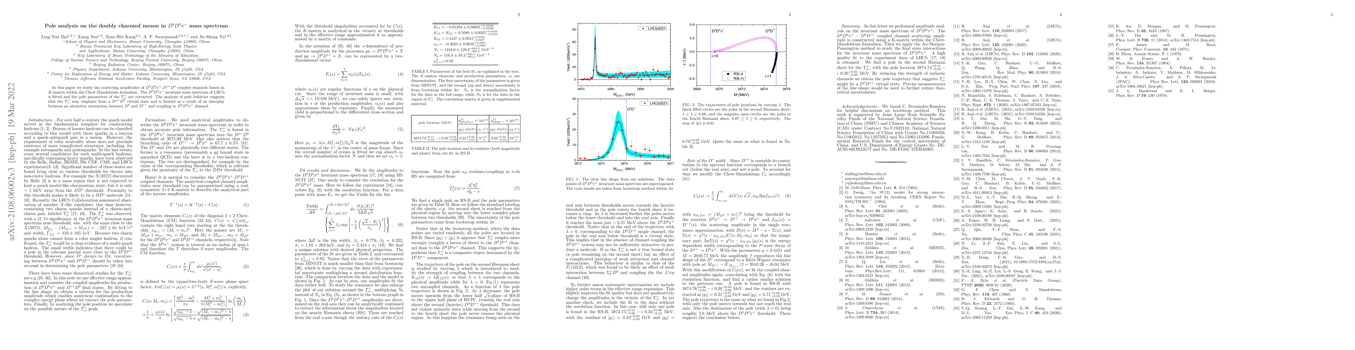 This study analyzes the scattering amplitudes of $D^0D^0pi^+$ and $D^*+D^0$ channels using the K-matrix within the Chew-Mandelstam formalism. The $D^0D^0pi^+$ invariant mass spectrum from LHCb data is fitted, extracting pole parameters of the $T_{cc}^+$ meson. The findings suggest that $T_{cc}^+$ might arise from a $D^*+D^0$ virtual state, formed due to attractive $D^0$-$D^*+$ interaction and coupling to the $D^0D^0pi^+$ channel.
