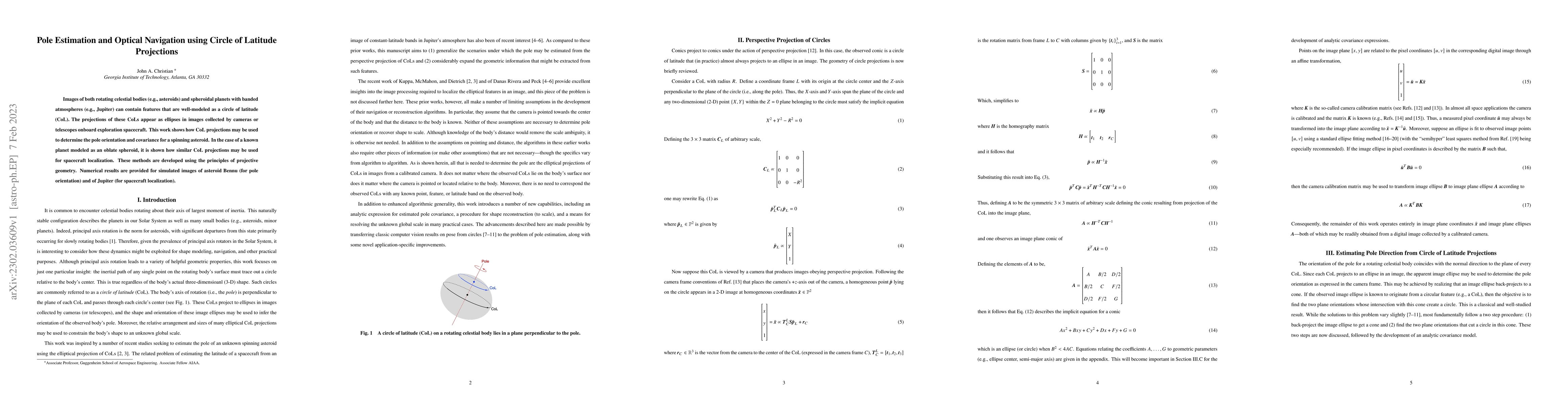 Images of both rotating celestial bodies (e.g., asteroids) and spheroidal planets with banded atmospheres (e.g., Jupiter) can contain features that are well-modeled as a circle of latitude (CoL). The projections of these CoLs appear as ellipses in images collected by cameras or telescopes onboard exploration spacecraft. This work shows how CoL projections may be used to determine the pole orientation and covariance for a spinning asteroid. In the case of a known planet modeled as an oblate spheroid, it is shown how similar CoL projections may be used for spacecraft localization. These methods are developed using the principles of projective geometry. Numerical results are provided for simulated images of asteroid Bennu (for pole orientation) and of Jupiter (for spacecraft localization).