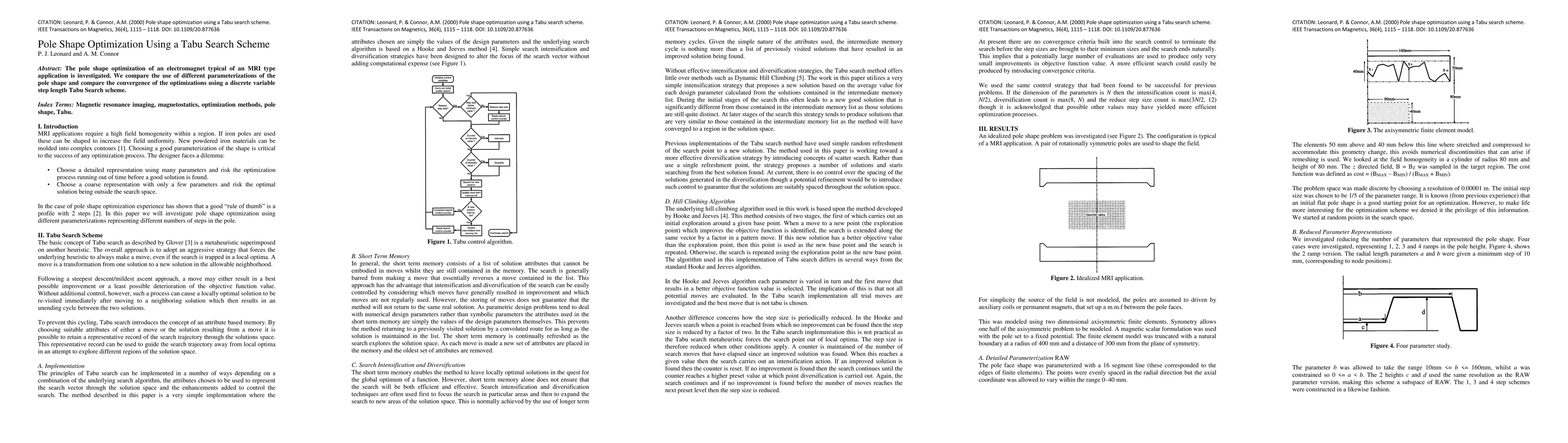 Researchers used a Tabu search scheme to optimize the shape of an electromagnet's pole for MRI applications, finding that different parameterizations lead to varying levels of convergence.