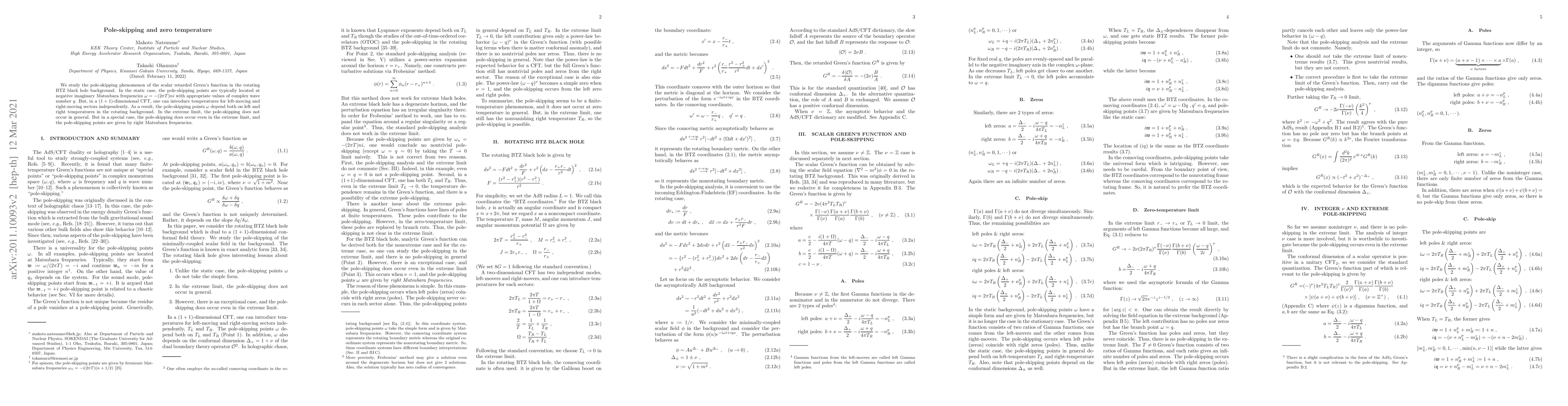 We study the pole-skipping phenomenon of the scalar retarded Green's function in the rotating BTZ black hole background. In the static case, the pole-skipping points are typically located at negative imaginary Matsubara frequencies $\omega=-(2\pi T)ni$ with appropriate values of complex wave number $q$. But, in a $(1+1)$-dimensional CFT, one can introduce temperatures for left-moving and right-moving sectors independently. As a result, the pole-skipping points $\omega$ depend both on left and right temperatures in the rotating background. In the extreme limit, the pole-skipping does not occur in general. But in a special case, the pole-skipping does occur even in the extreme limit, and the pole-skipping points are given by right Matsubara frequencies.