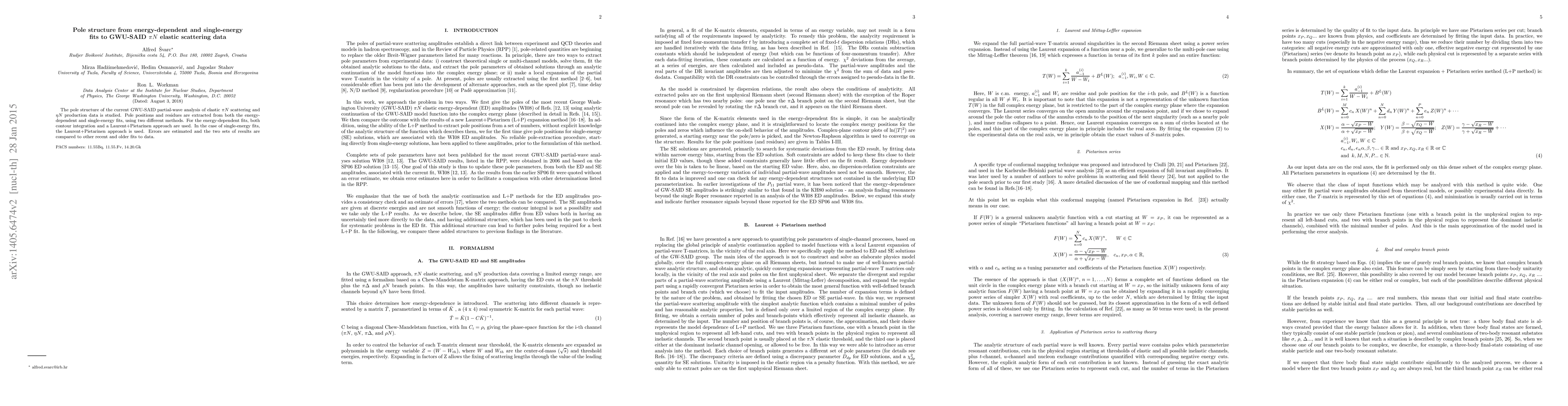 The study employs the Laurent+Pietarinen (L+P) expansion method to analyze the pole structure of the GW/SAID partial-wave analysis for elastic $\pi N$ scattering and $\eta N$ production data. Two methods are used for extracting pole positions and residues: contour integration and the L+P approach for energy-dependent fits, and the L+P approach alone for single-energy fits. The method incorporates unitarity constraints and penalty functions to ensure a soft cutoff of higher-order terms and correct proportion of contributions from penalty functions and data.