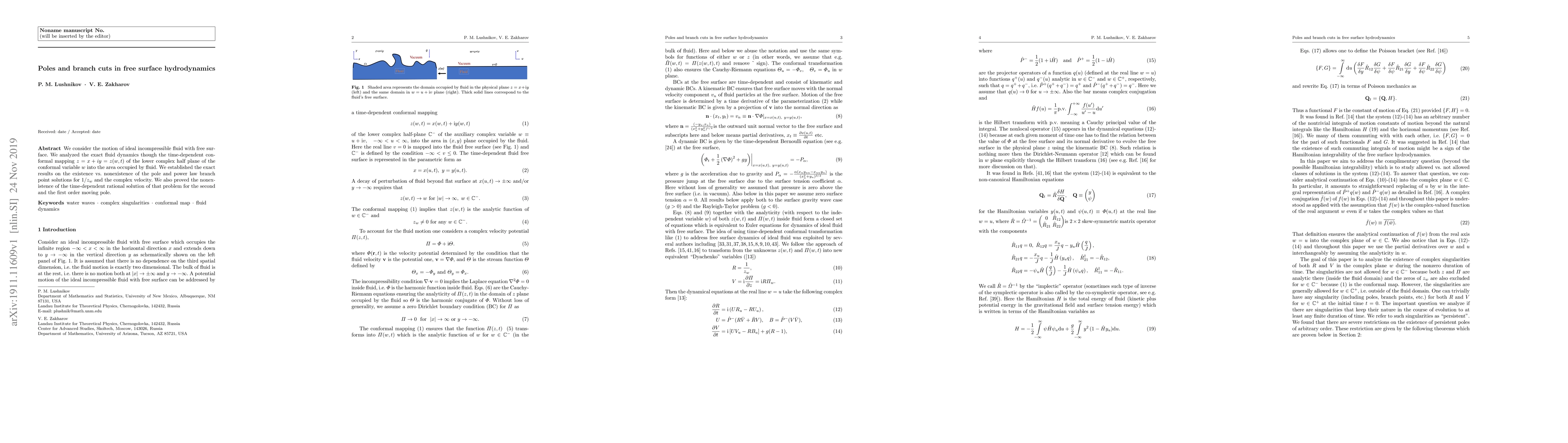 This research explores ideal incompressible fluid motion with free surfaces, using conformal mapping to analyze exact fluid dynamics. It establishes the existence or nonexistence of pole and power law branch point solutions for $1/z_w$ and complex velocity, proving no time-dependent rational solutions exist for second and first order moving poles.