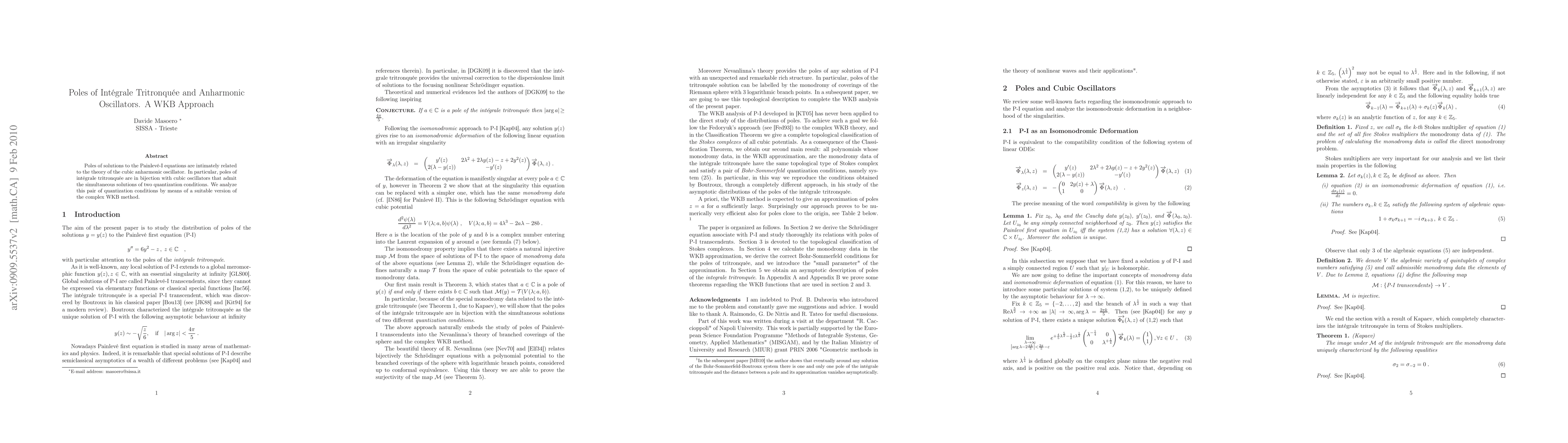 Poles of solutions to the Painleve-I equation are intimately related to the theory of the cubic anharmonic oscillator. In particular, poles of integrale tritronquee are in 1-1 correspondence with cubic oscillators that admit the simultaneous solutions of two quantization conditions. We analyze this pair of quantization conditions by means of a suitable version of the complex WKB method.