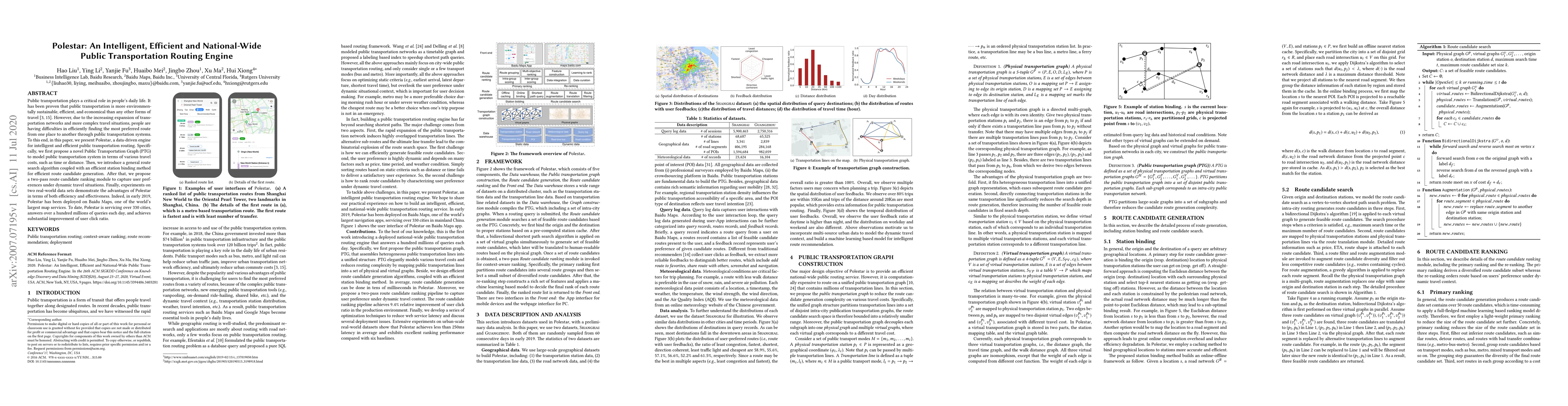 Polestar is a data-driven engine designed for intelligent and efficient public transportation routing, utilizing a novel Public Transportation Graph (PTG) to model travel costs and employing advanced algorithms for route search and ranking. Deployed on Baidu Maps, it significantly enhances route finding efficiency and effectiveness across 330 cities.