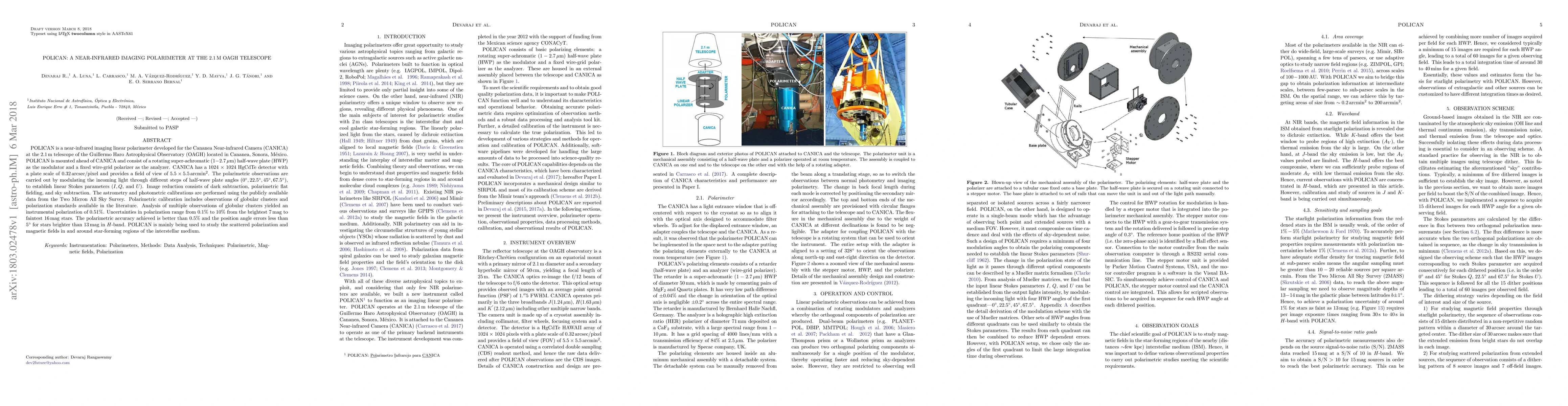 POLICAN is a near-infrared imaging linear polarimeter developed for the Cananea Near-infrared Camera (CANICA) at the 2.1m telescope of the Guillermo Haro Astrophysical Observatory (OAGH) located in Cananea, Sonora, Mexico. POLICAN is mounted ahead of CANICA and consist of a rotating super-achromatic 1-2.7 micron half-wave plate (HWP) as the modulator and a fixed wire-grid polarizer as the analyzer. CANICA has a 1024 x 1024 HgCdTe detector with a plate scale of 0.32 arcsec/pixel and provides a field of view of 5.5 x 5.5 arcmin^2. The polarimetric observations are carried out by modulating the incoming light through different steps of half-wave plate angles 0, 22.5, 45, 67.5 deg, to establish linear Stokes parameters (I, Q, and U). Image reduction consists of dark subtraction, polarimetric flat fielding, and sky subtraction. The astrometry and photometric calibrations are performed using the publicly available data from the Two Micron All Sky Survey. Polarimetric calibration includes observations of globular clusters and polarization standards available in the literature. Analysis of multiple observations of globular clusters yielded an instrumental polarization of 0.51%. Uncertainties in polarization range from 0.1% to 10% from the brightest 7 mag to faintest 16 mag stars. The polarimetric accuracy achieved is better than 0.5% and the position angle errors less than 5 deg for stars brighter than 13 mag in H-band. POLICAN is mainly being used to study the scattered polarization and magnetic fields in and around star-forming regions of the interstellar medium.