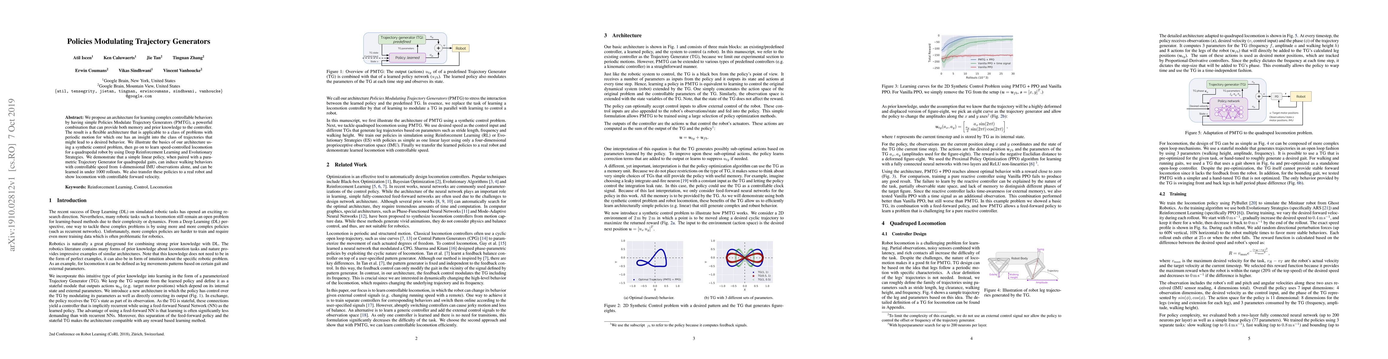 This research introduces Policies Modulating Trajectory Generators (PMTG), an architecture that combines simple policies with powerful generators for learning complex, controllable behaviors, particularly for periodic motion tasks. The method is demonstrated through a synthetic control problem and a quadrupedal robot's speed-controlled locomotion, achieving walking behaviors with controllable speed using only IMU observations and under 1000 rollouts. The learned policies are also successfully transferred to a real robot for controllable locomotion.