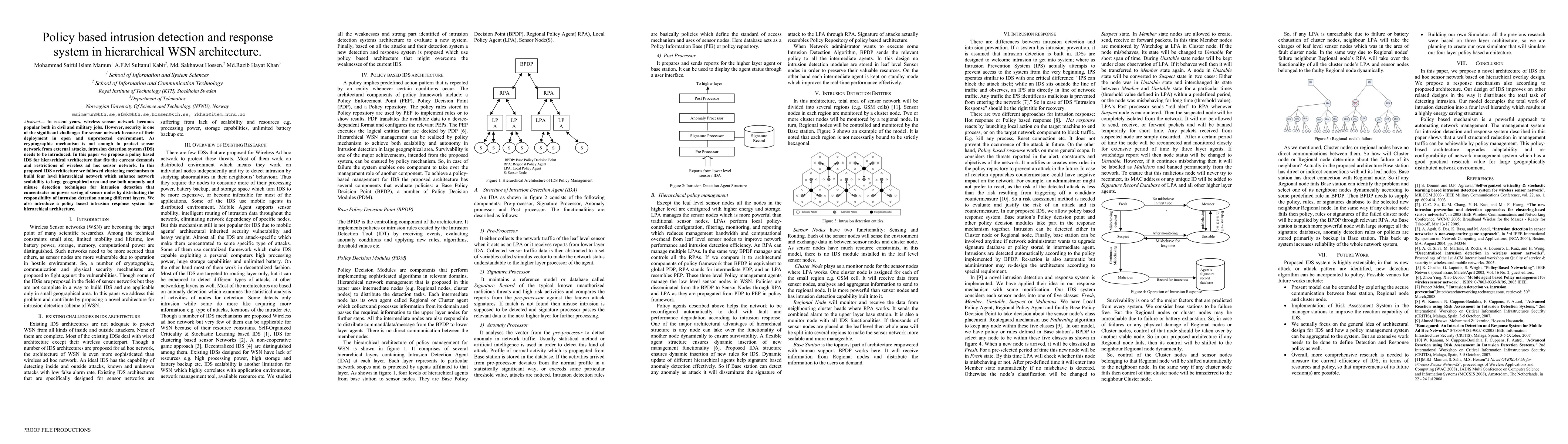 This paper proposes a policy-based intrusion detection system (IDS) for hierarchical wireless sensor networks (WSN) to address security challenges. The IDS employs clustering for a four-level architecture, combining anomaly and misuse detection techniques to enhance scalability and power efficiency by distributing detection responsibilities across layers.