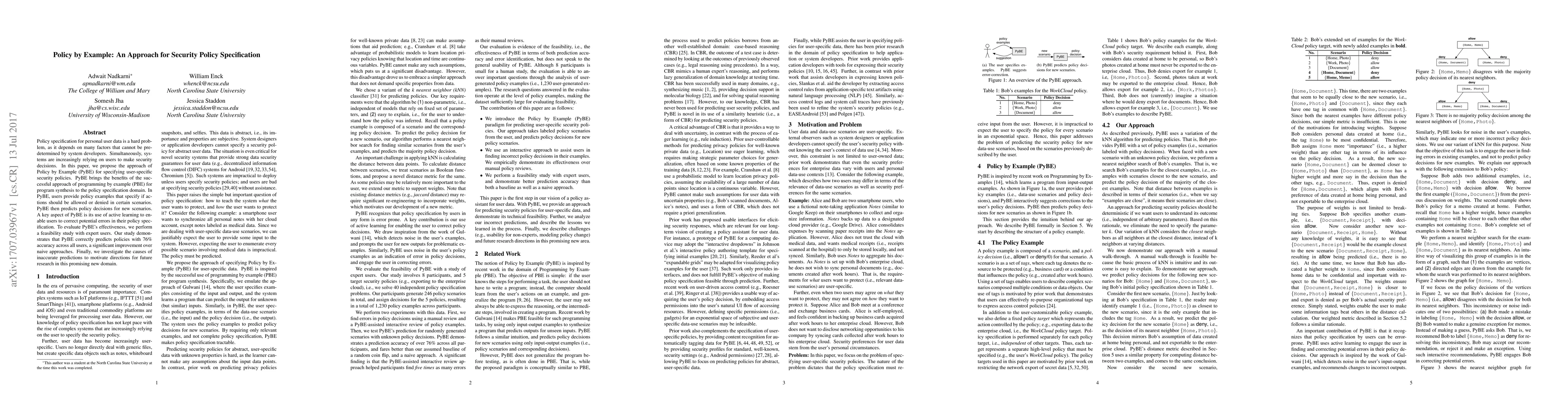 Policy specification for personal user data is a hard problem, as it depends on many factors that cannot be predetermined by system developers. Simultaneously, systems are increasingly relying on users to make security decisions. In this paper, we propose the approach of Policy by Example (PyBE) for specifying user-specific security policies. PyBE brings the benefits of the successful approach of programming by example (PBE) for program synthesis to the policy specification domain. In PyBE, users provide policy examples that specify if actions should be allowed or denied in certain scenarios. PyBE then predicts policy decisions for new scenarios. A key aspect of PyBE is its use of active learning to enable users to correct potential errors in their policy specification. To evaluate PyBE's effectiveness, we perform a feasibility study with expert users. Our study demonstrates that PyBE correctly predicts policies with 76% accuracy across all users, a significant improvement over naive approaches. Finally, we investigate the causes of inaccurate predictions to motivate directions for future research in this promising new domain.