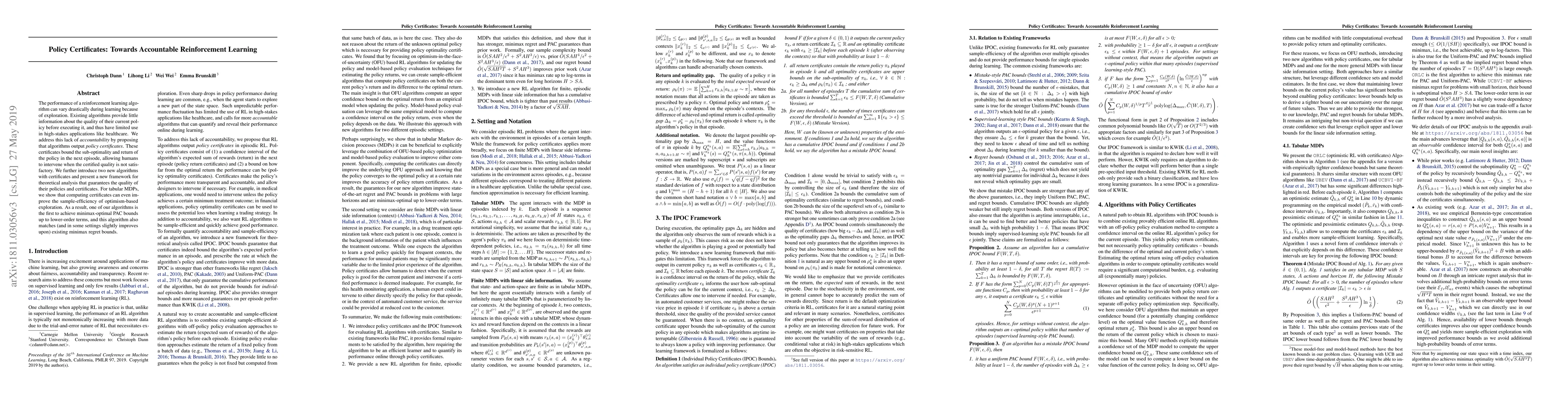 This paper proposes policy certificates to enhance accountability in reinforcement learning, allowing algorithms to bound policy performance and enabling human intervention when necessary. The authors introduce new algorithms that generate these certificates and provide a theoretical framework to analyze their performance, achieving minimax-optimal bounds and improved sample-efficiency for tabular MDPs.