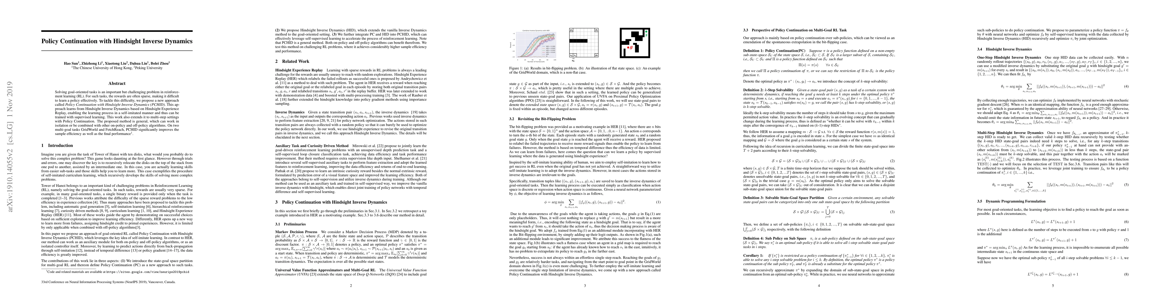 The paper proposes Policy Continuation with Hindsight Inverse Dynamics (PCHID) to enhance goal-oriented reinforcement learning tasks with sparse rewards. It leverages hindsight experience replay and inverse dynamics for self-imitation and supervised learning, showing improved sample efficiency and performance on multi-goal tasks.