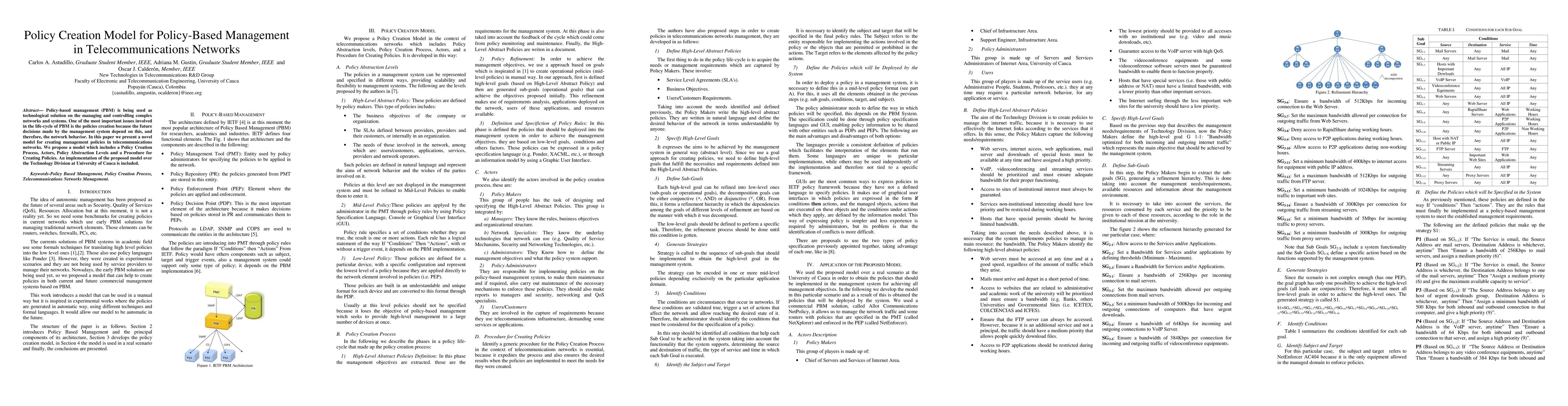 This paper introduces a novel model for creating management policies in telecommunications networks, emphasizing a Policy Creation Process, involved actors, abstraction levels, and a procedure for policy creation. An implementation example is provided through the Technology Division at the University of Cauca.