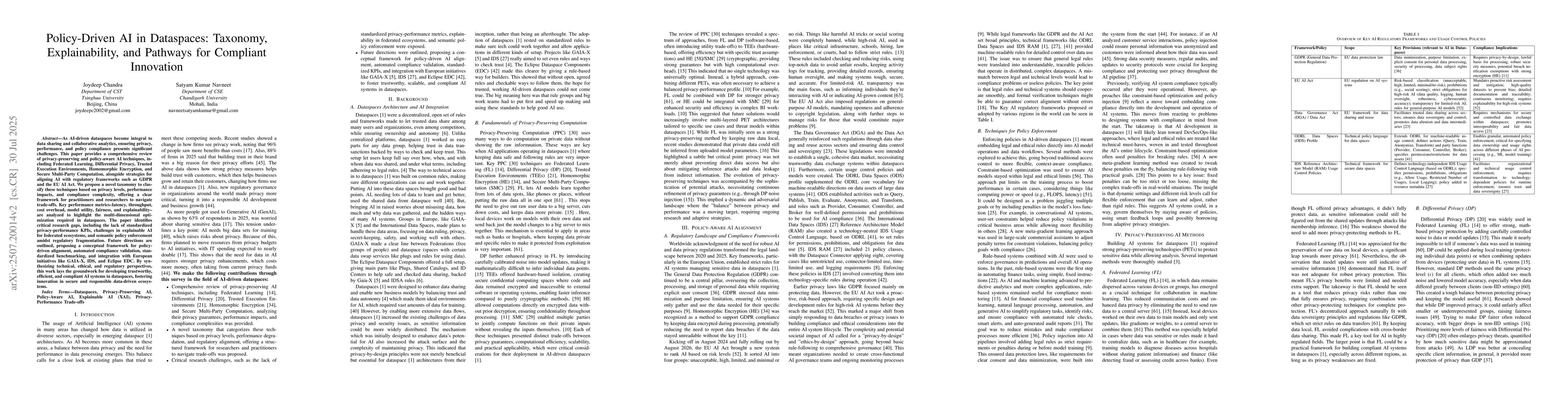 As AI-driven dataspaces become integral to data sharing and collaborative analytics, ensuring privacy, performance, and policy compliance presents significant challenges. This paper provides a comprehensive review of privacy-preserving and policy-aware AI techniques, including Federated Learning, Differential Privacy, Trusted Execution Environments, Homomorphic Encryption, and Secure Multi-Party Computation, alongside strategies for aligning AI with regulatory frameworks such as GDPR and the EU AI Act. We propose a novel taxonomy to classify these techniques based on privacy levels, performance impacts, and compliance complexity, offering a clear framework for practitioners and researchers to navigate trade-offs. Key performance metrics -- latency, throughput, cost overhead, model utility, fairness, and explainability -- are analyzed to highlight the multi-dimensional optimization required in dataspaces. The paper identifies critical research gaps, including the lack of standardized privacy-performance KPIs, challenges in explainable AI for federated ecosystems, and semantic policy enforcement amidst regulatory fragmentation. Future directions are outlined, proposing a conceptual framework for policy-driven alignment, automated compliance validation, standardized benchmarking, and integration with European initiatives like GAIA-X, IDS, and Eclipse EDC. By synthesizing technical, ethical, and regulatory perspectives, this work lays the groundwork for developing trustworthy, efficient, and compliant AI systems in dataspaces, fostering innovation in secure and responsible data-driven ecosystems.