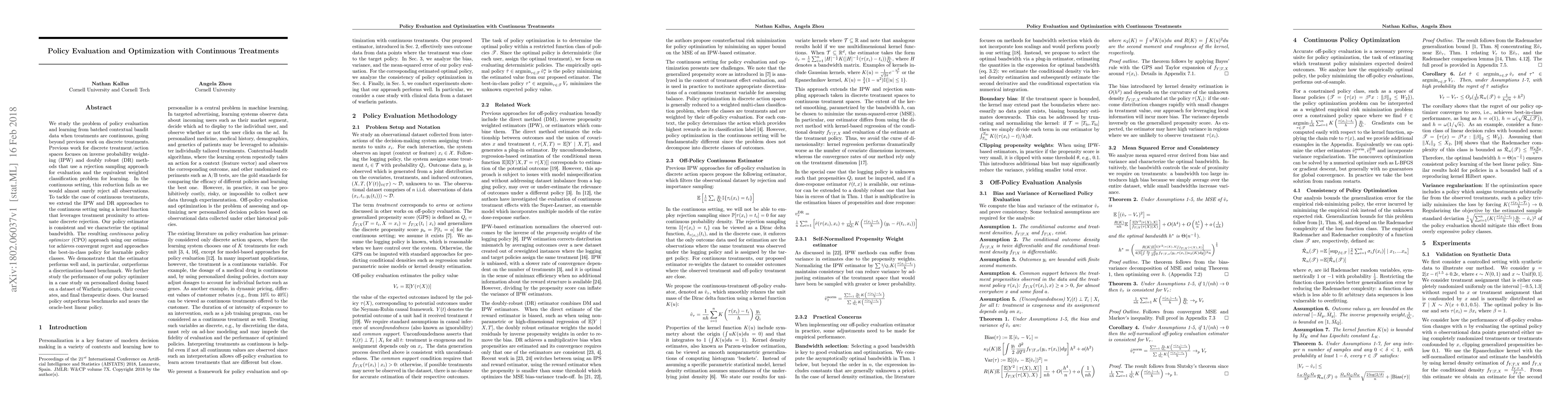 This paper extends inverse probability weighting and doubly robust methods to evaluate and optimize policies for continuous treatments, using a kernel function to handle treatment proximity. The proposed continuous policy optimizer achieves convergent regret and outperforms discretization-based benchmarks, demonstrated through a personalized dosing case study for Warfarin patients.