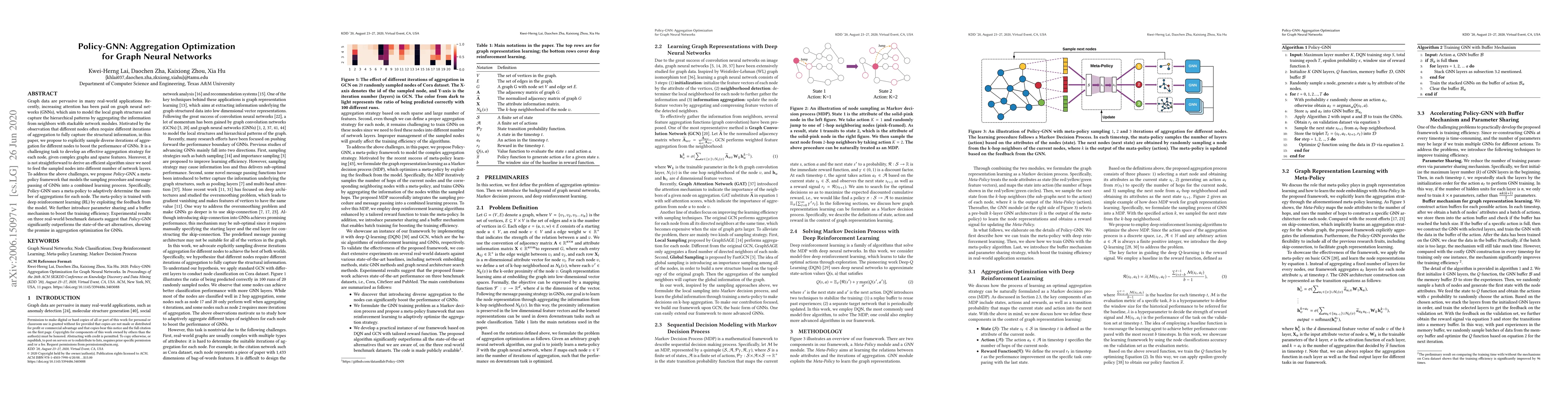 This paper proposes Policy-GNN, a meta-policy framework to adaptively determine the optimal number of aggregations for each node in graph neural networks (GNNs) by using deep reinforcement learning. The approach significantly outperforms state-of-the-art alternatives on benchmark datasets, demonstrating its effectiveness in aggregation optimization for GNNs.