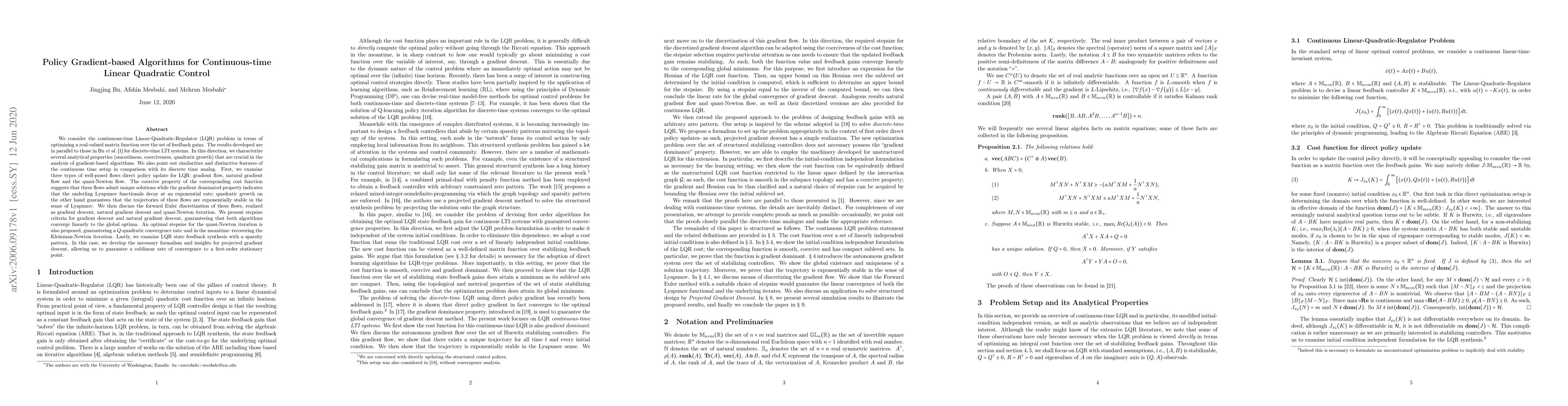 The paper proposes policy gradient-based algorithms for continuous-time linear quadratic control, analyzing three types of well-posed flows: gradient flow, natural gradient flow, and quasi-Newton flow. It examines their stability properties and presents stepsize criteria for gradient descent and natural gradient descent, guaranteeing linear convergence to global optima.
