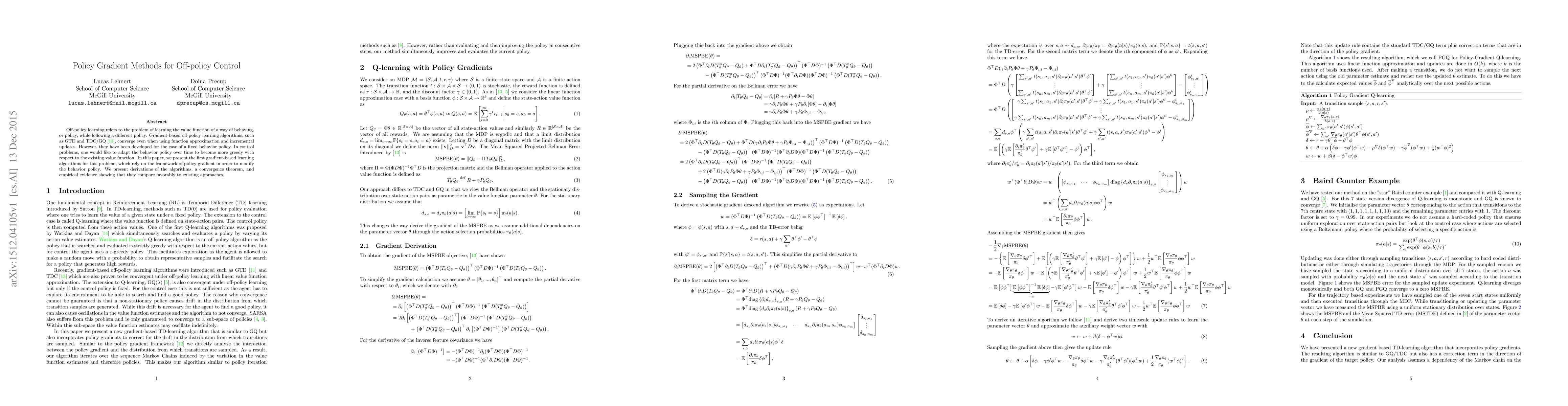 This paper introduces gradient-based learning algorithms for off-policy control, utilizing policy gradient methods to adapt the behavior policy over time. The proposed algorithms demonstrate convergence and outperform existing methods in empirical evaluations.