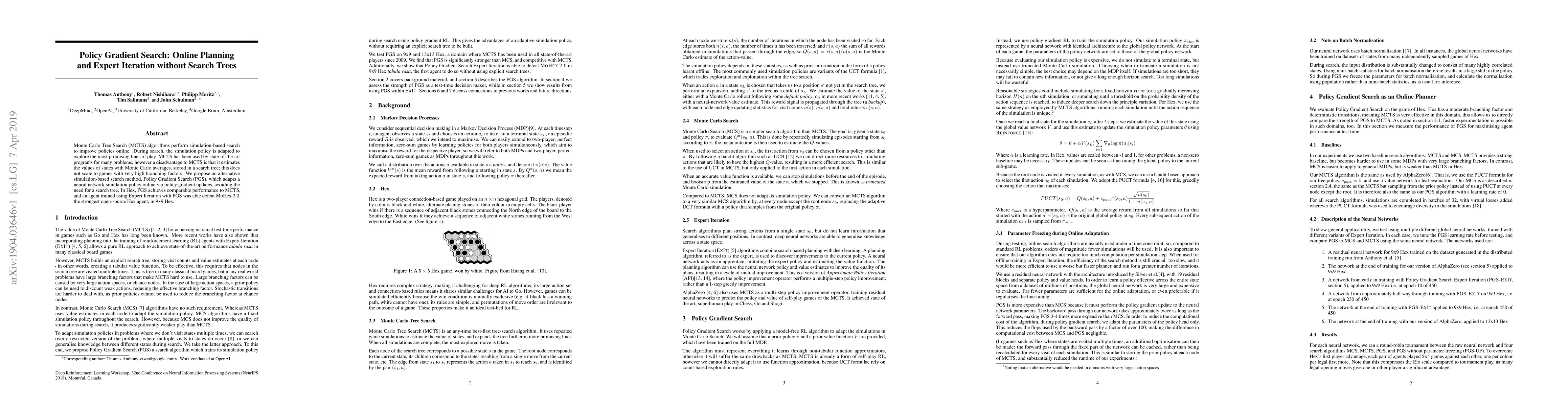Title: Policy Gradient Search: Online Planning and Expert Iteration without Search Trees Summary: This paper proposes Policy Gradient Search (PGS), an alternative to Monte Carlo Tree Search (MCTS) that adapts a neural network simulation policy via policy gradient updates, avoiding the need for a search tree. PGS achieves comparable performance in Hex and outperforms the strongest open-source Hex agent using Expert Iteration.
