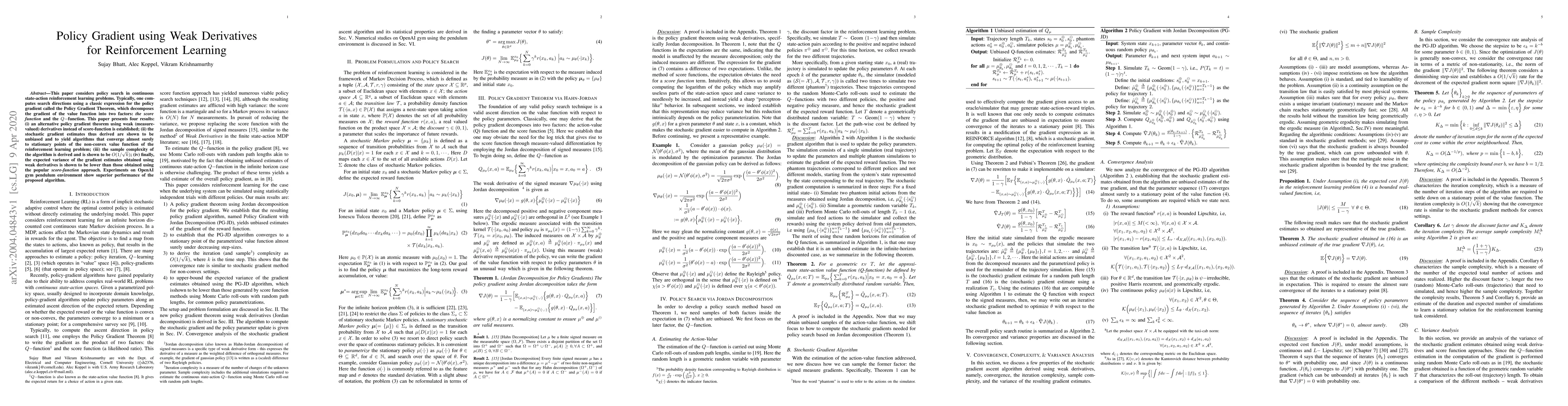 This paper considers policy search in continuous state-action reinforcement learning problems. Typically, one computes search directions using a classic expression for the policy gradient called the Policy Gradient Theorem, which decomposes the gradient of the value function into two factors: the score function and the Q-function. This paper presents four results:(i) an alternative policy gradient theorem using weak (measure-valued) derivatives instead of score-function is established; (ii) the stochastic gradient estimates thus derived are shown to be unbiased and to yield algorithms that converge almost surely to stationary points of the non-convex value function of the reinforcement learning problem; (iii) the sample complexity of the algorithm is derived and is shown to be $O(1/\sqrt(k))$; (iv) finally, the expected variance of the gradient estimates obtained using weak derivatives is shown to be lower than those obtained using the popular score-function approach. Experiments on OpenAI gym pendulum environment show superior performance of the proposed algorithm.