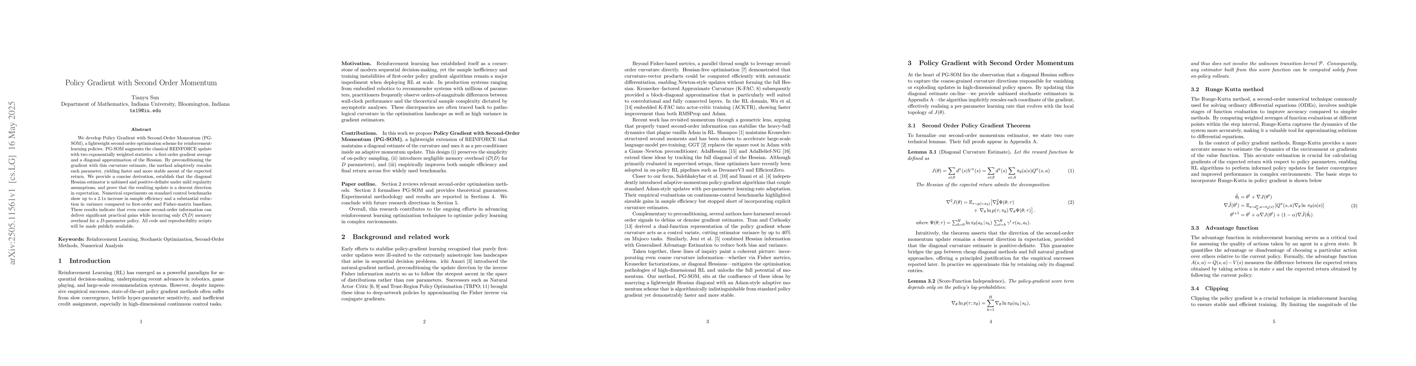 The research develops Policy Gradient with Second-Order Momentum (PG-SOM), an optimization scheme for reinforcement-learning policies by augmenting the REINFORCE update with exponentially weighted first-order gradient average and a diagonal Hessian approximation.