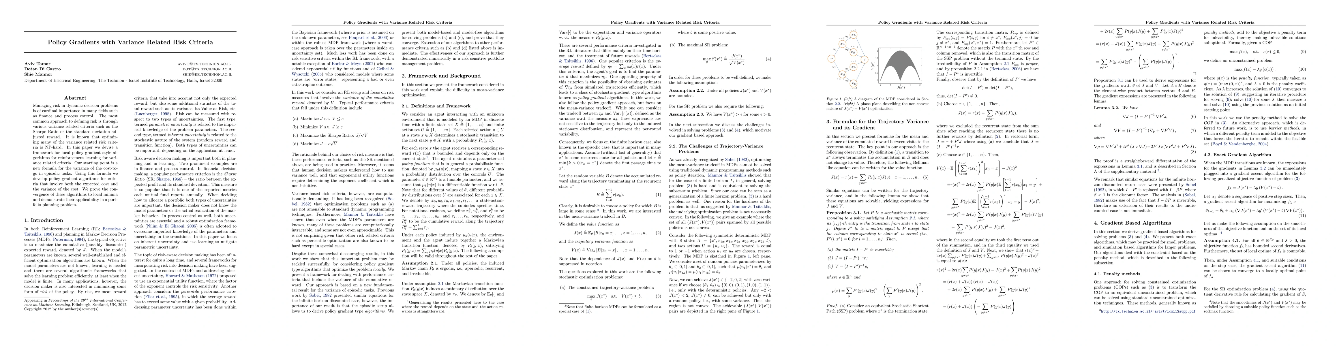 Managing risk in dynamic decision problems is of cardinal importance in many fields such as finance and process control. The most common approach to defining risk is through various variance related criteria such as the Sharpe Ratio or the standard deviation adjusted reward. It is known that optimizing many of the variance related risk criteria is NP-hard. In this paper we devise a framework for local policy gradient style algorithms for reinforcement learning for variance related criteria. Our starting point is a new formula for the variance of the cost-to-go in episodic tasks. Using this formula we develop policy gradient algorithms for criteria that involve both the expected cost and the variance of the cost. We prove the convergence of these algorithms to local minima and demonstrate their applicability in a portfolio planning problem.